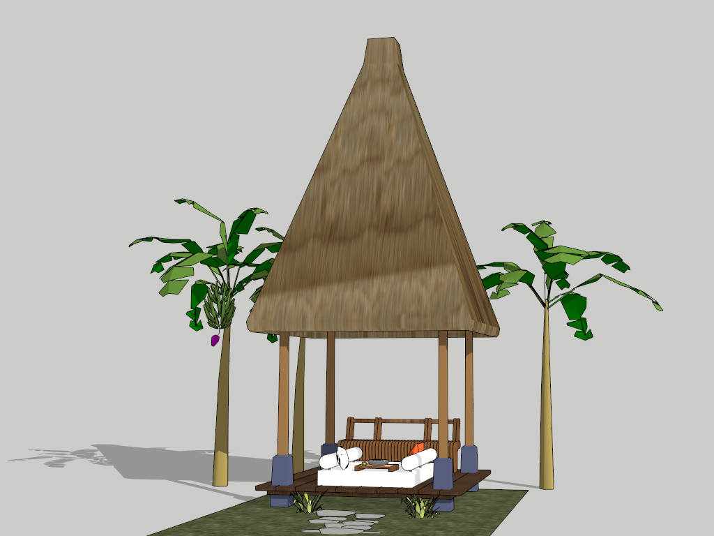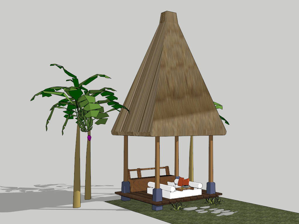 Tropical Gazebo Garden Design 694Tropical gazebo with seat cushion and banana trees sketchup 3d model.DownloadEdges:53840Faces:25752File Version:SketchUp 7.skp File Size:14.9 MBTag Count:14Materials:205Render:NoneGazebos