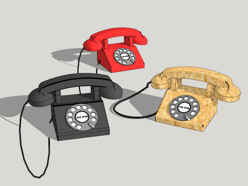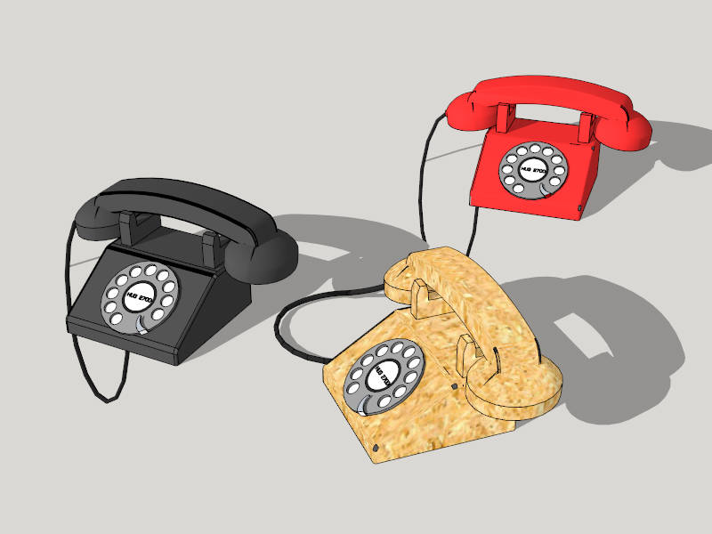 Old Landline Phones Electronics 490Old landline phones. red, yellow and black rotary dial telephones sketchup 3d model.DownloadEdges:22812Faces:9222File Version:SketchUp 8.skp File Size:5.37 MBTag Count:2Materials:11Render:NoneOffice EquipmentPhones