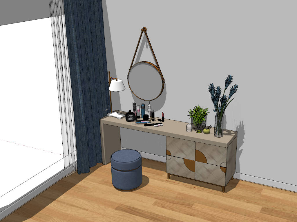 Luxury modern dressing table sketchup 3d model, round stool and wall mirror, vase cosmetics and table lamp on the table.