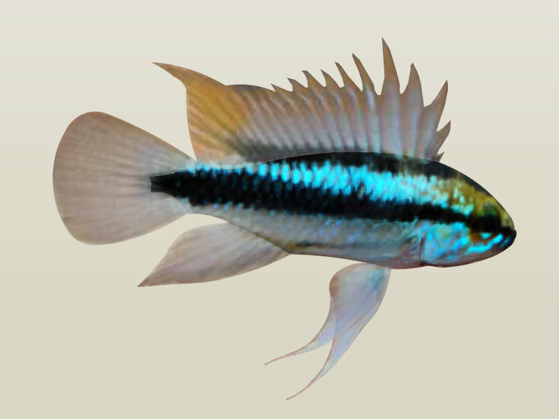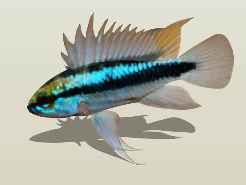 Three-striped Dwarf Cichlid Animals 612Three-striped dwarf cichlid sketchup 3d model.DownloadEdges:8845Faces:5289File Version:SketchUp 8.skp File Size:3.7 MBTag Count:1Materials:2Render:NoneFish