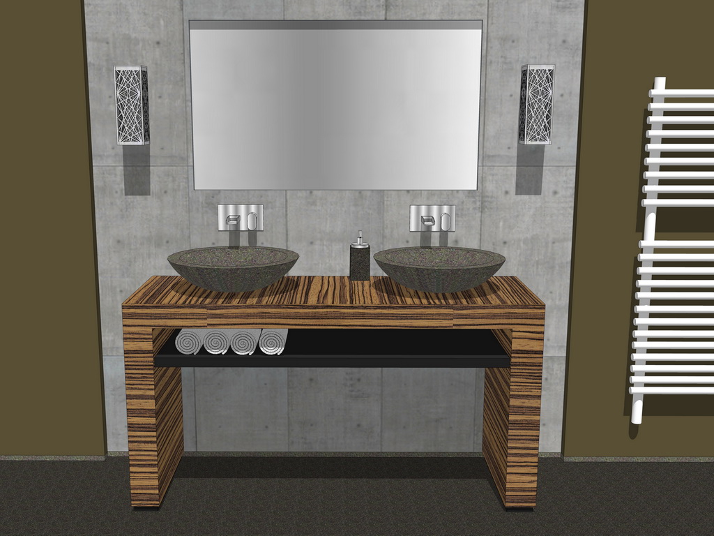 Double sink bathroom vanity design sketchup 3d model, stone countertop basins, mirror, wall lamps and wall mounted radiator.