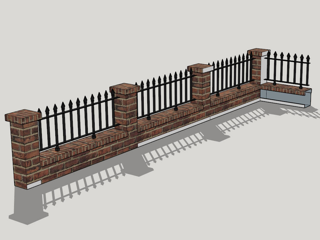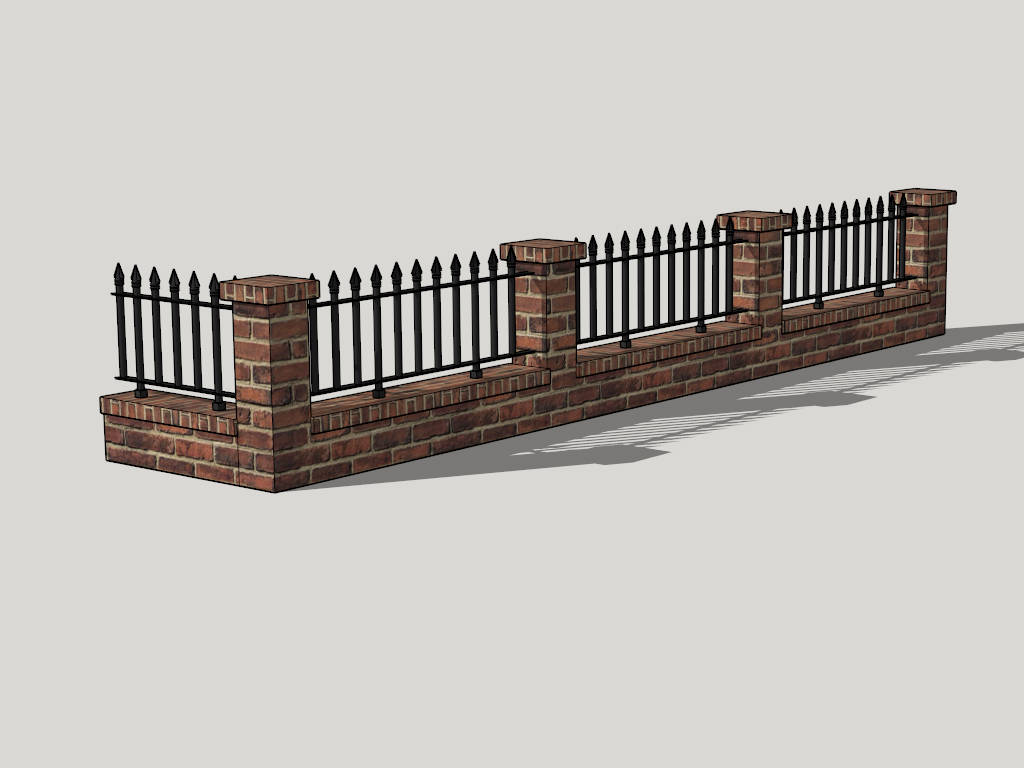 Iron and Brick Fence Architectural Elements 1.26kBlack iron fence with brick columns sketchup 3d model.DownloadEdges:4968Faces:2606File Version:SketchUp 8.skp File Size:227 KBTag Count:2Materials:3Render:NoneFences