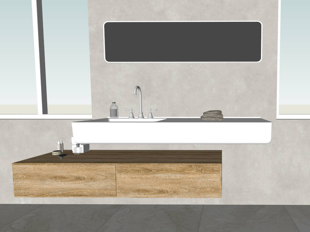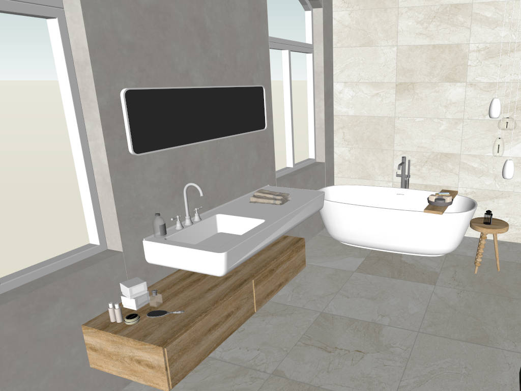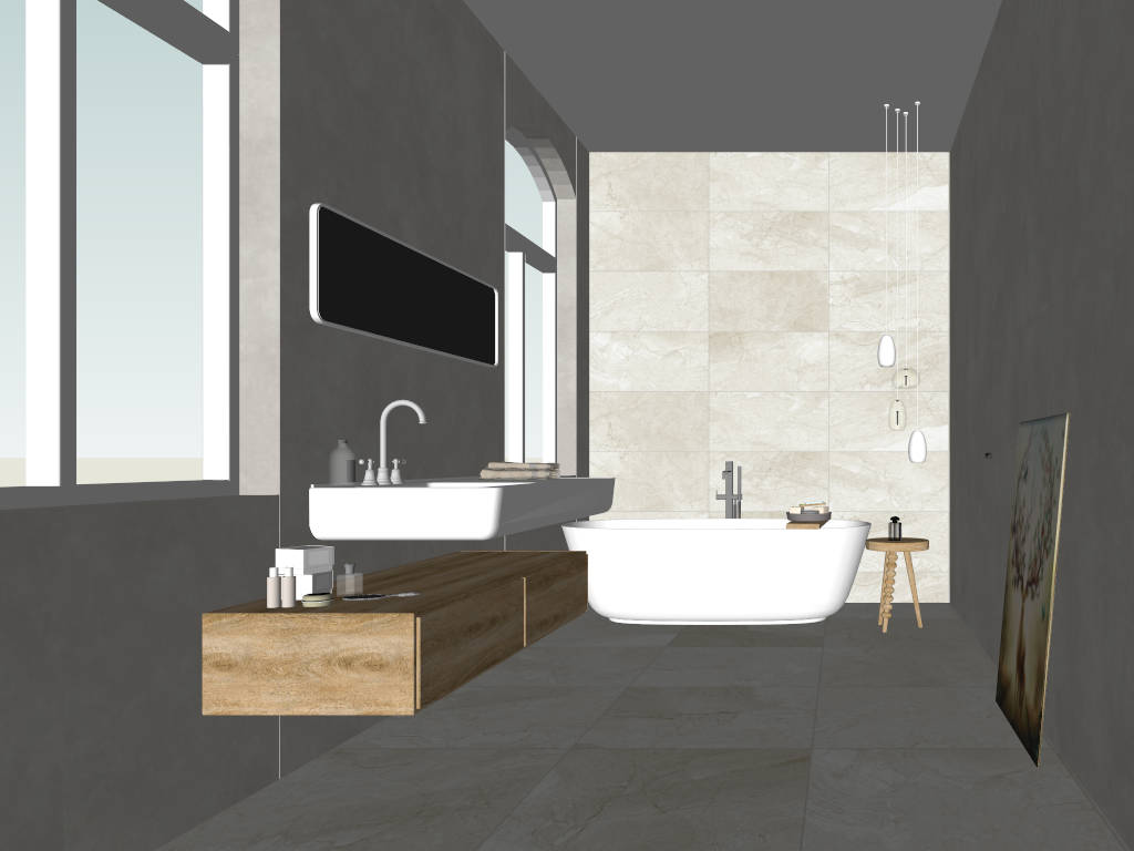 Narrow bathroom design sketchup 3d model, wall mounted single sink vanity, mirror, freestanding bathtub, pendant light and other bathroom accessories.