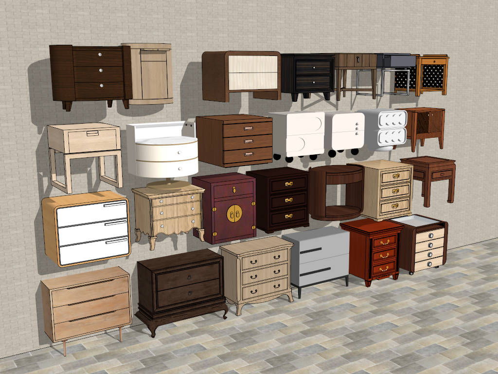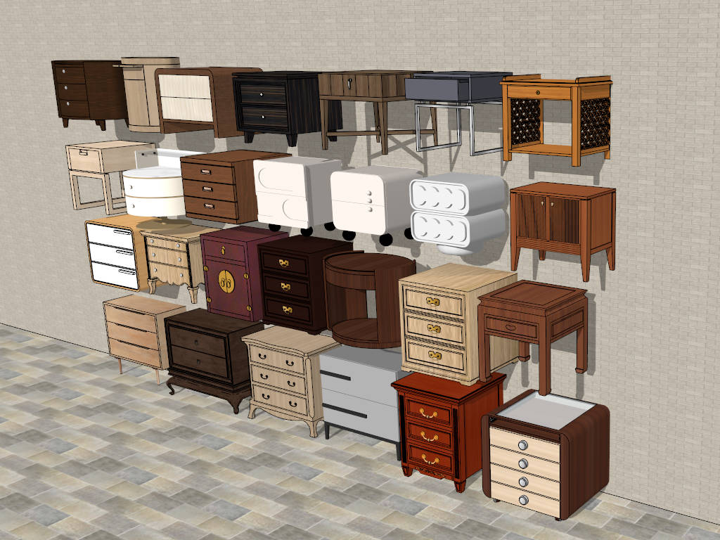 A collection of 27 nightstands and bedside tables sketchup 3d model, it covers a range of design styles to meet various interior design preferences.