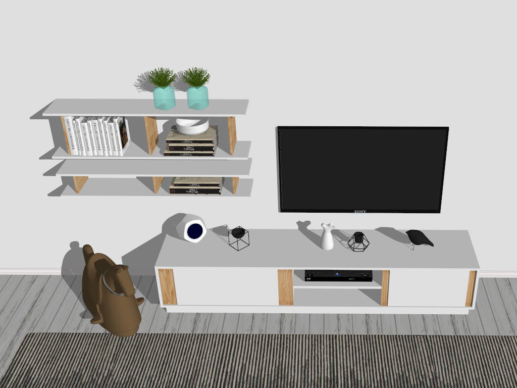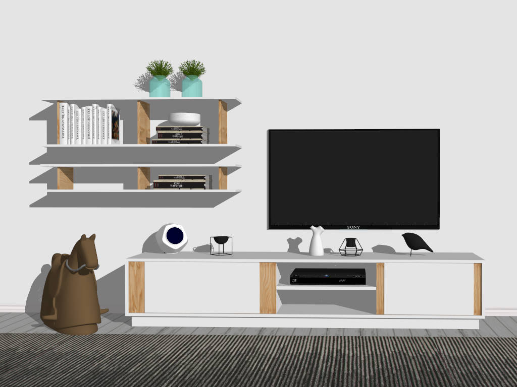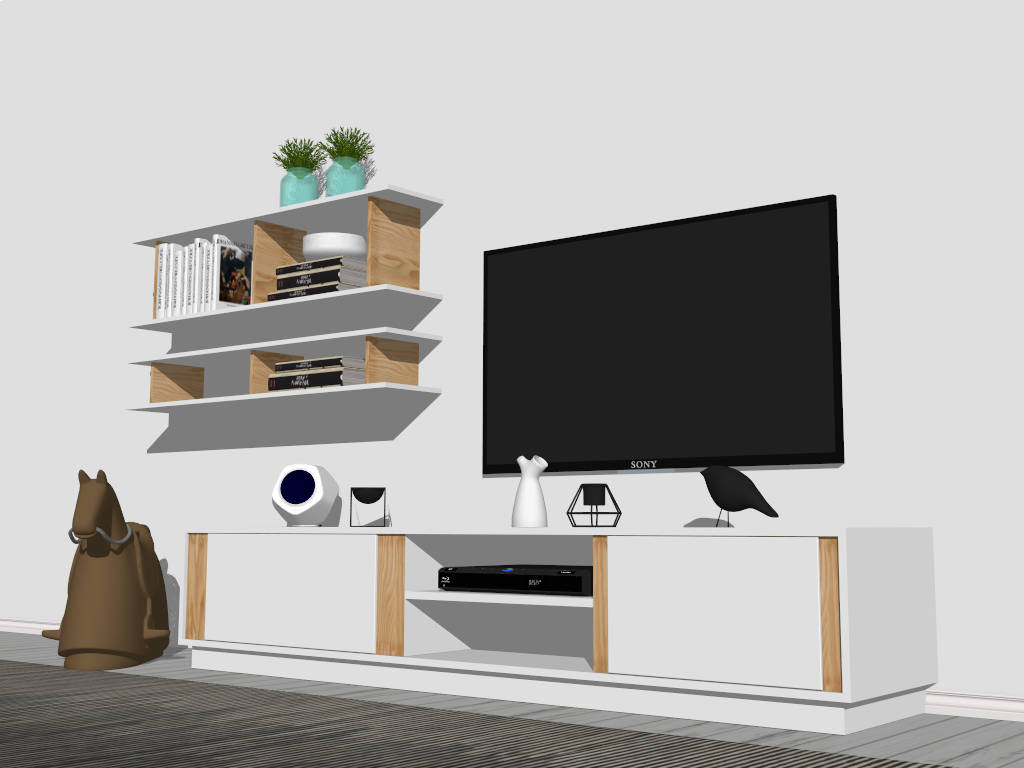 Modern minimalist tv wall design sketchup 3d model, white TV stand cabinet, wall mount TV and bookshelf.