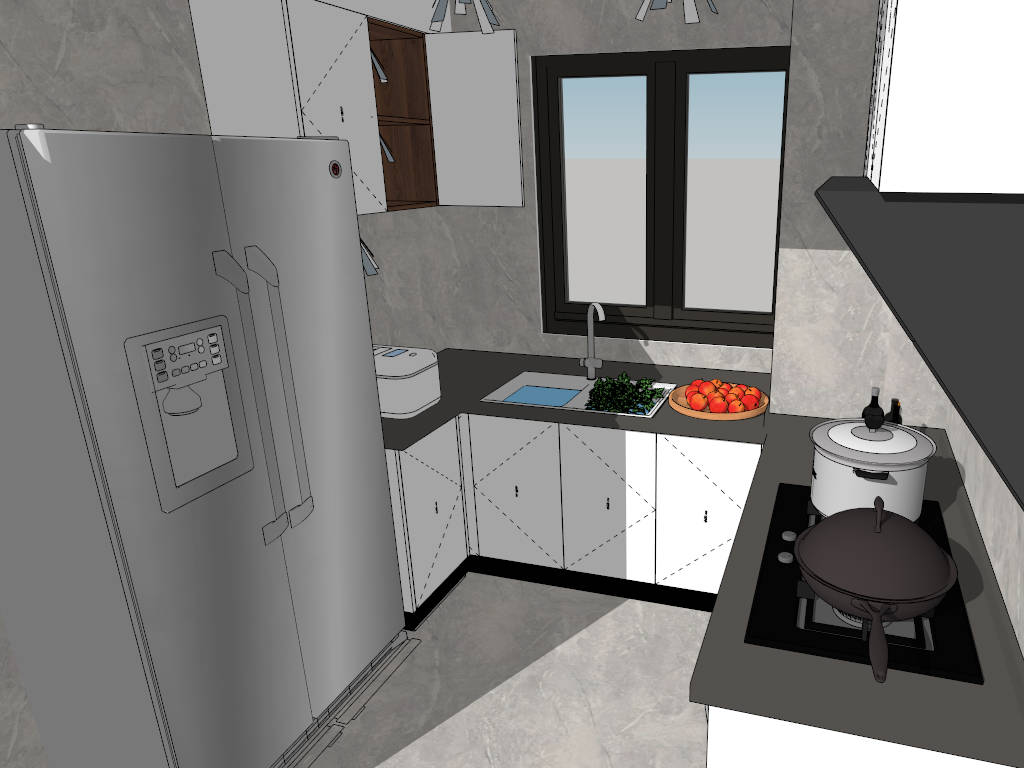 Small U shaped kitchen idea sketchup 3d model, the kitchen design with U shaped cabinets with sink, wall mount cabinets, build in kitchen appliances, range hood and side by side refrigerator.
