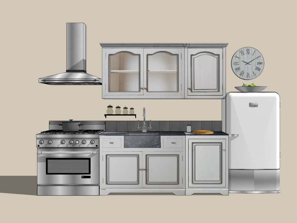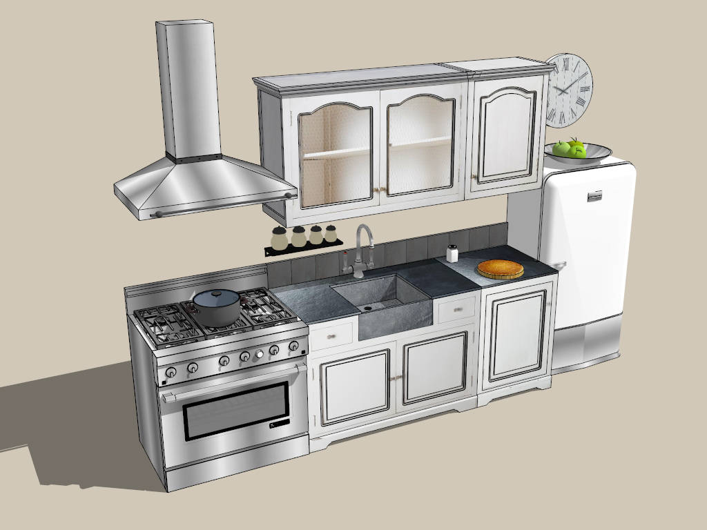 Retro apartment kitchen design sketchup 3d model, white straight-line kitchen cabinets with sink and wall cupboard, free stand stove, wall mount range hood and refrigerator.