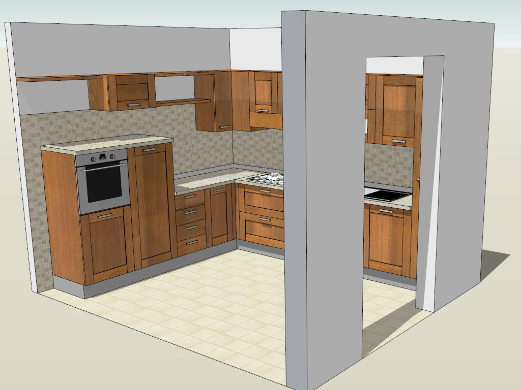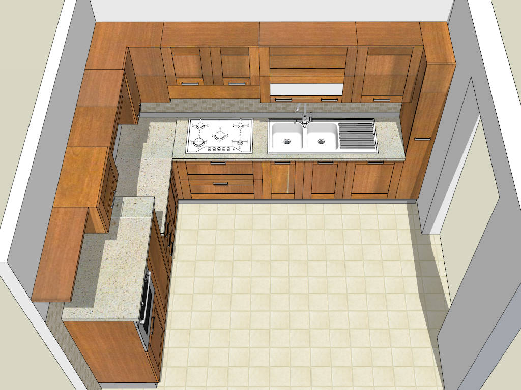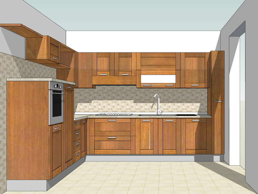 Retro L-kitchen design sketchup 3d model, rustic wood kitchen cabinets with quartz countertop, wall mount cupboard, built-in oven and double basin kitchen sink.
