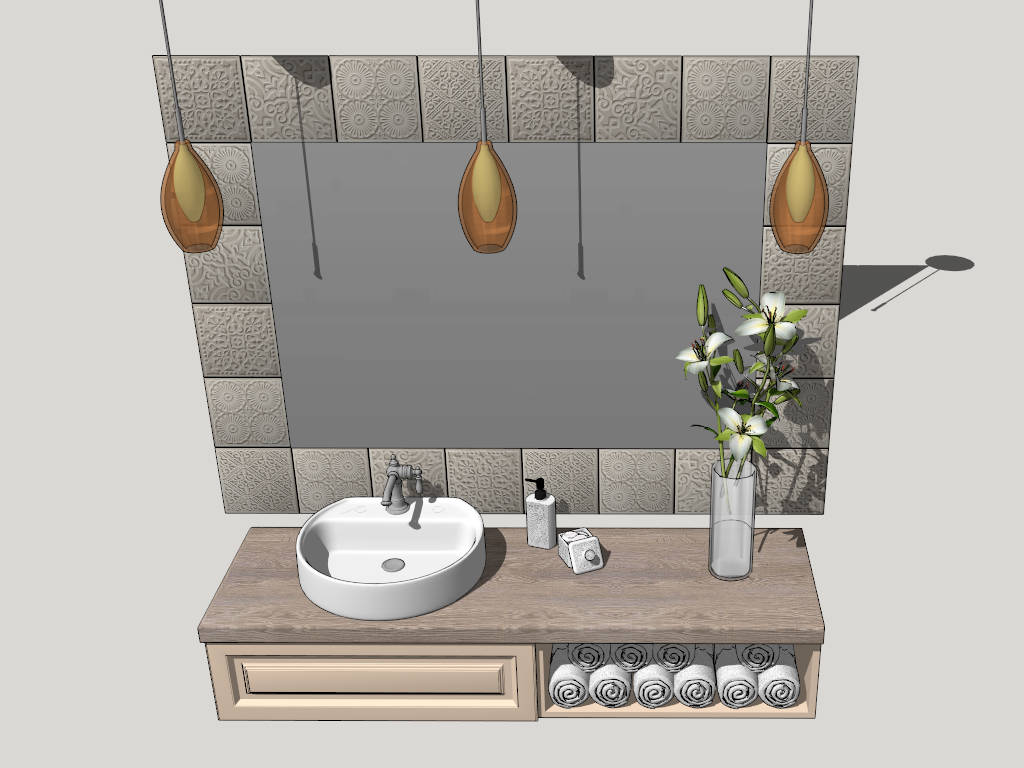Floating bathroom vanity sketchup 3d model, wall mount vanity with round single sink, vintage tile around mirror, and pendant light fixtures.