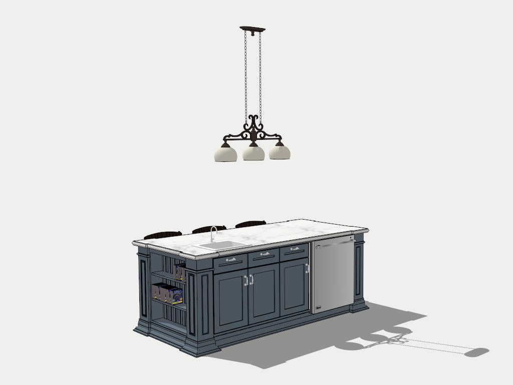 Primitive kitchen island idea sketchup 3d model, the blue island design with build in kitchen appliances, 4 stools and vintage pendant lights.