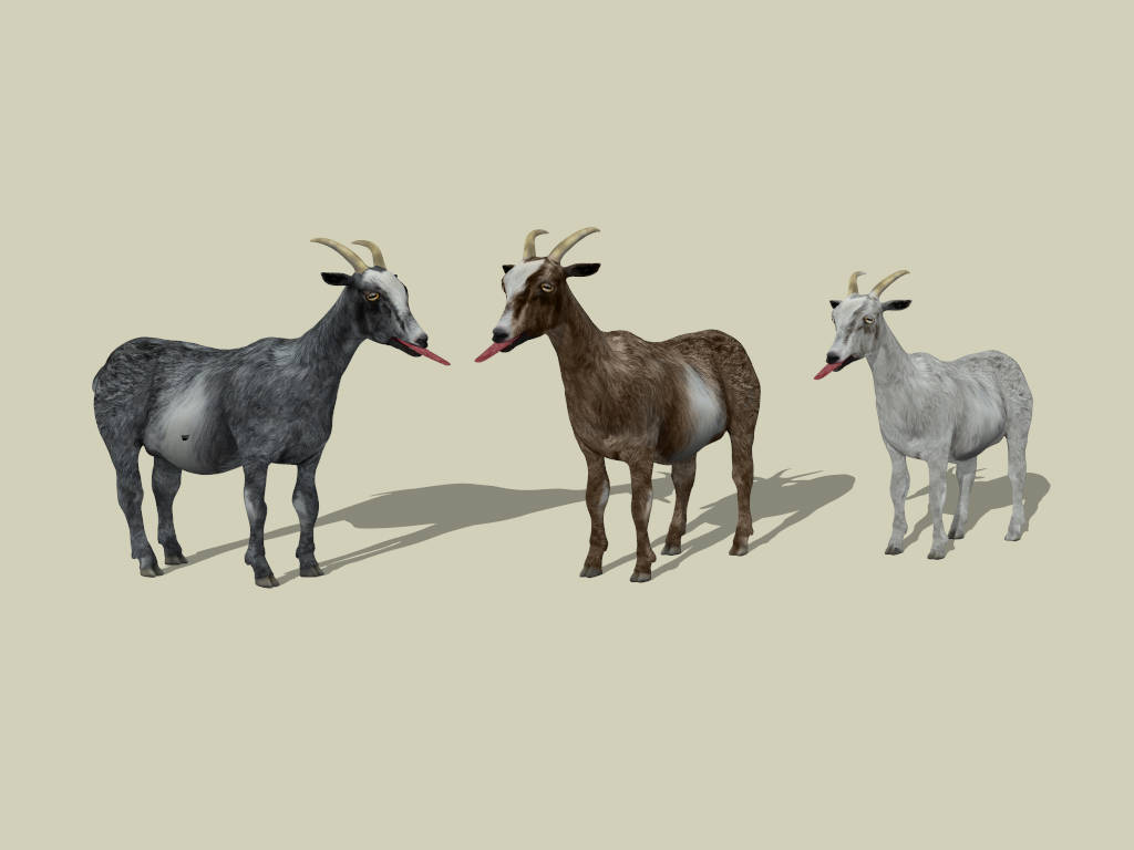 Three Goats Animals 993Three goats. white, grey, and brown goat sketchup 3d model.DownloadEdges:108726Faces:70431File Version:SketchUp 8.skp File Size:34.8 MBTag Count:1Materials:3Render:NoneDomesticated AnimalsGoatMammalsSheep