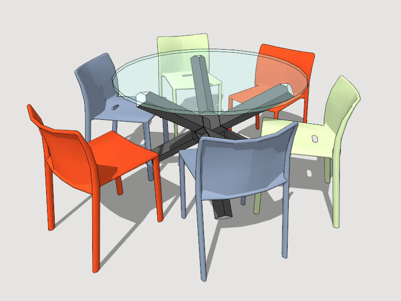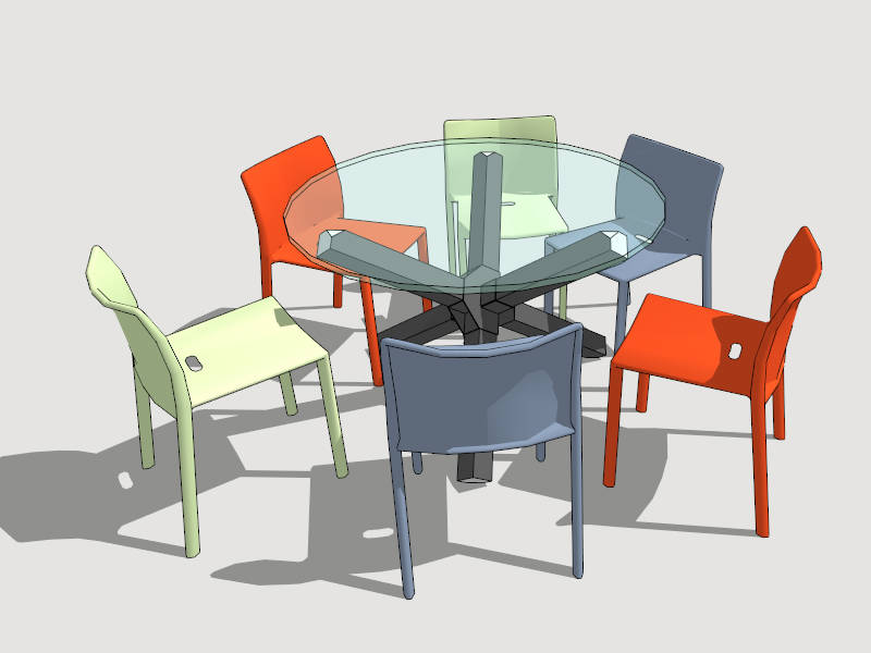 Industrial loft style dining room set glass top round dining table and 6 colorful chairs sketchup 3d model for dining interior design.