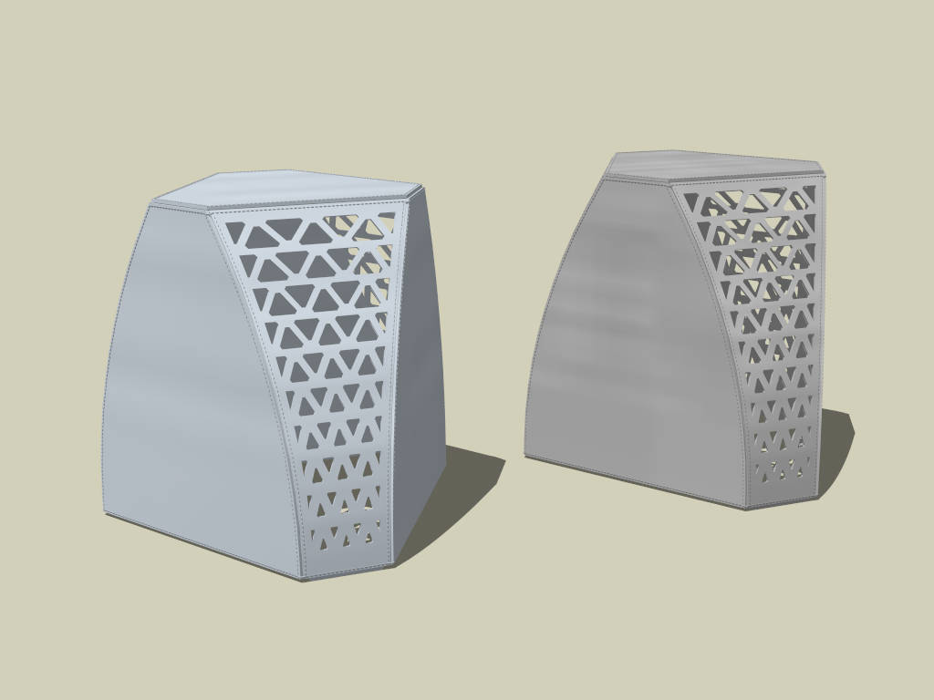 Lattice Stools Furniture 986Lattice stools sketchup 3d model for furniture design.DownloadEdges:239512Faces:150576File Version:SketchUp 8.skp File Size:29.2 MBTag Count:1Materials:12Render:NoneLatticeworkStool