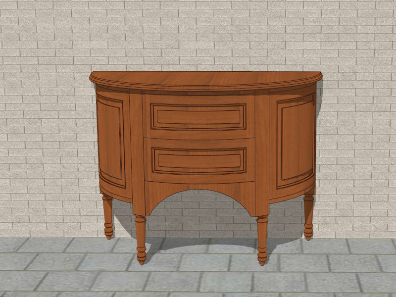 Half Moon Console Cabinet Furniture 1.24kHalf moon shaped vintage console cabinet sketchup 3d model for interior design.DownloadEdges:6437Faces:2971File Version:SketchUp 7.skp File Size:605 KBTag Count:2Materials:1Render:NoneConsole TableTables