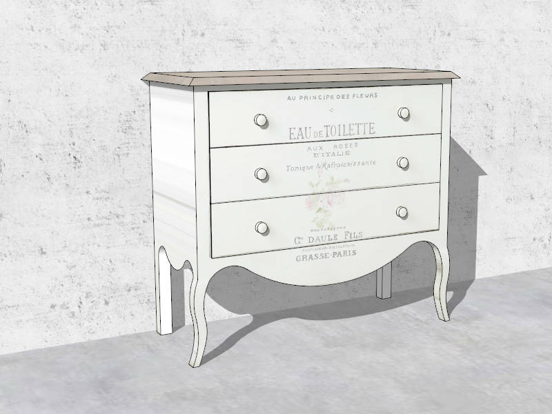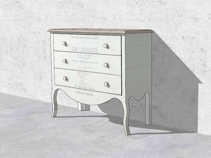 Small White Dresser Bedroom 1.25kAntique white 3 drawer dresser sketchup 3d model for bed room interior design.DownloadEdges:1473Faces:498File Version:SketchUp 8.skp File Size:673 KBTag Count:1Materials:4Render:NoneBedroom FurnitureDressers