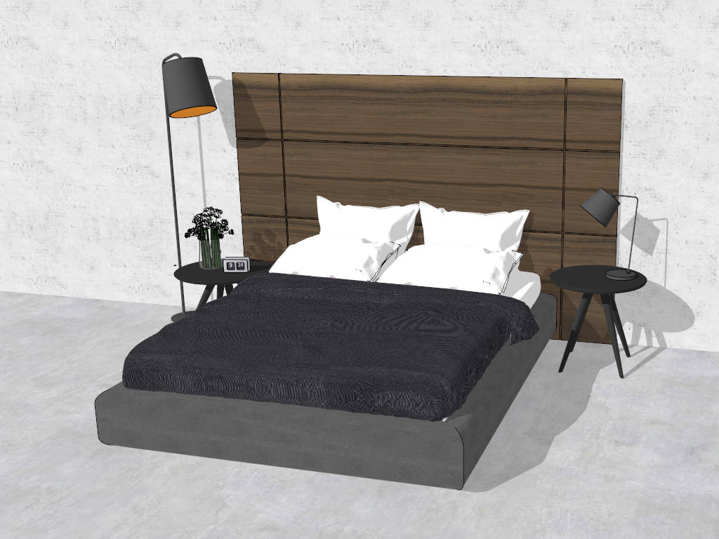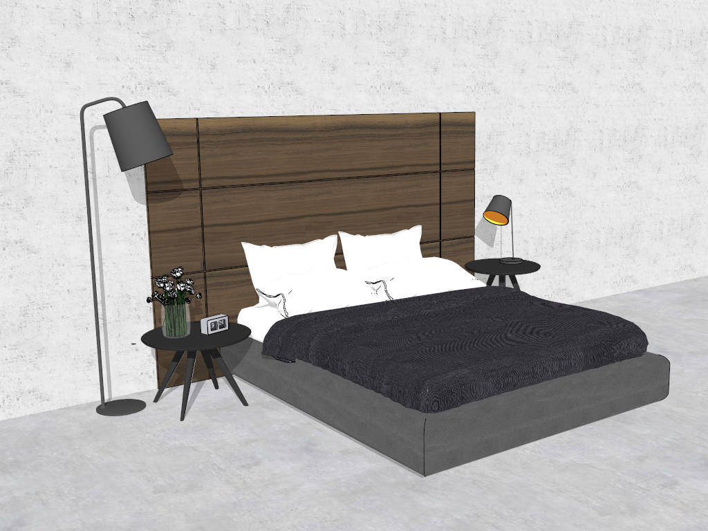 Modern platform bed with headboard bed side tables and lamps sketchup 3d model for bed room interior design.