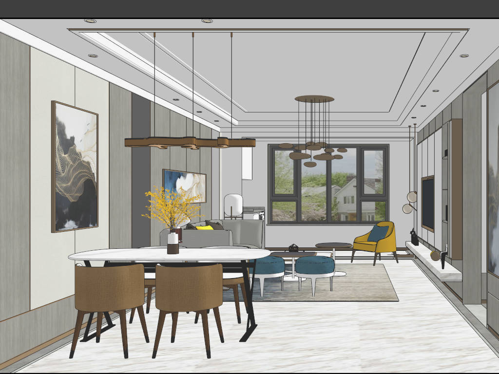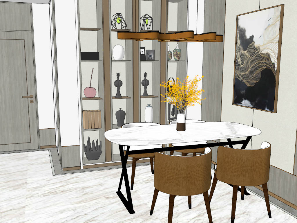 Modern condo living room with dining area sketchup 3d model for interior design, living room furniture set, living room tv accent wall, 5-piece dining table set and display shelf.