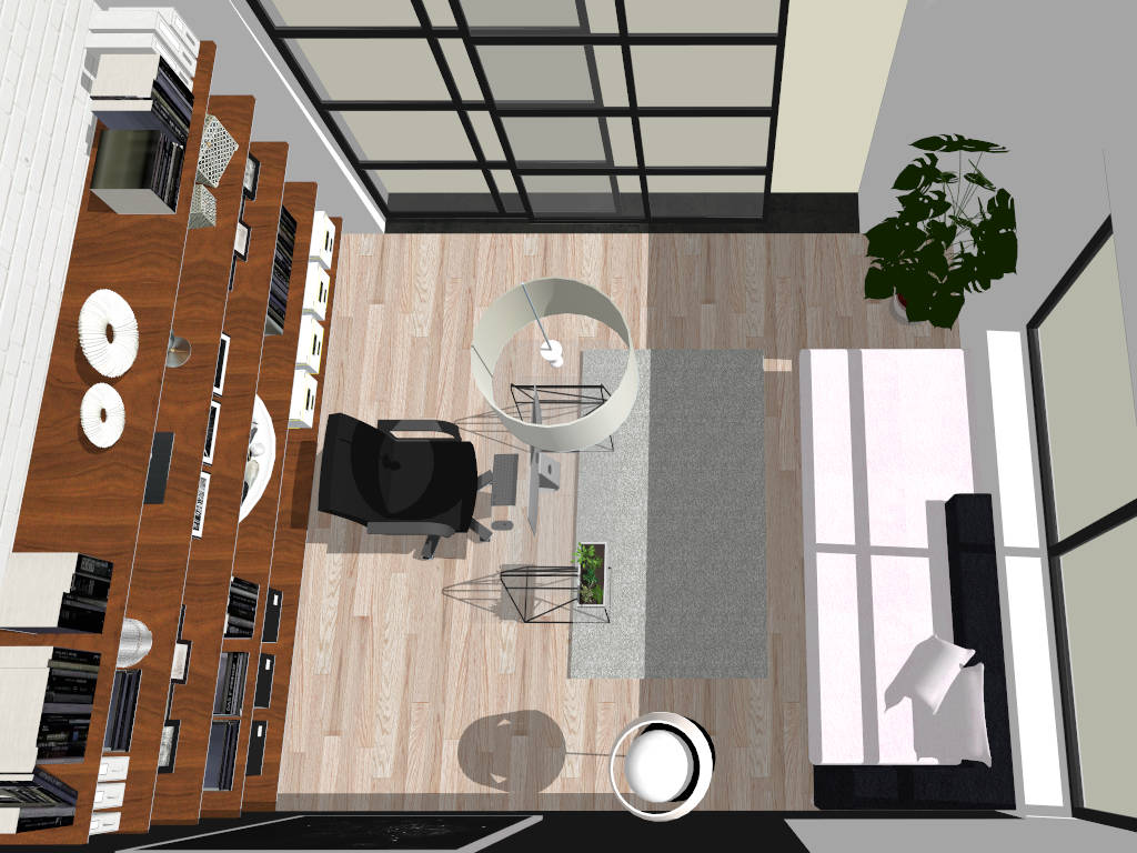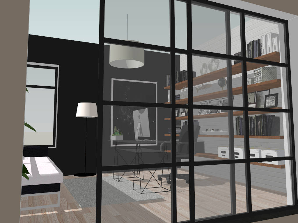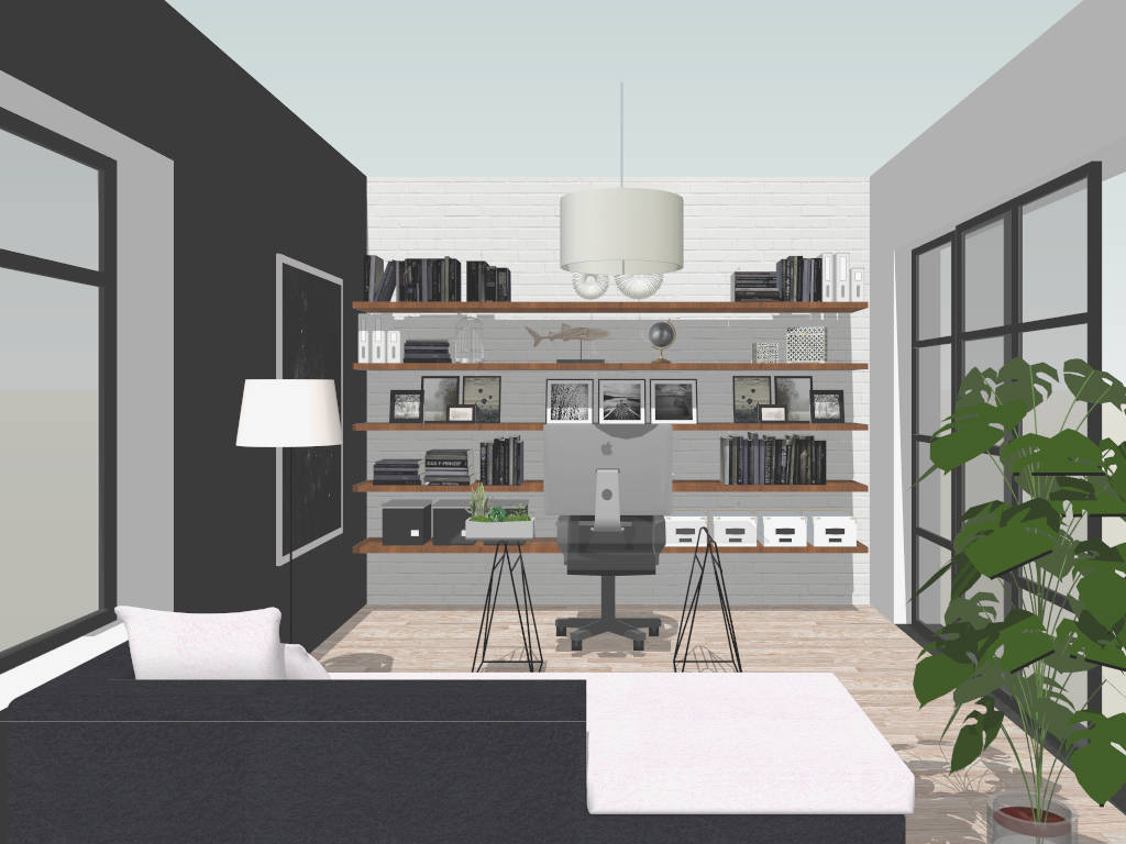 Minimalist home office idea sketchup 3d model for interior design, glass computer desk and chair, black accent wall, wall mount bookshelf and white sofa.