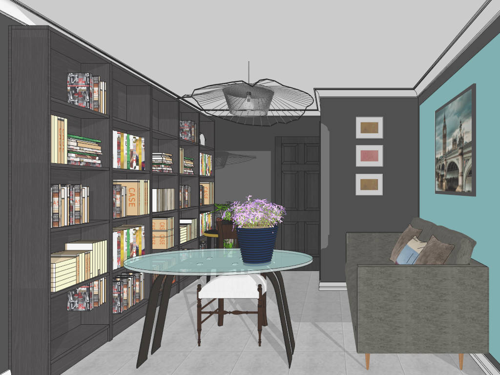 Small home office space design with bookcase wall unit, glass desk and small sofa sketchup 3d model for interior design.