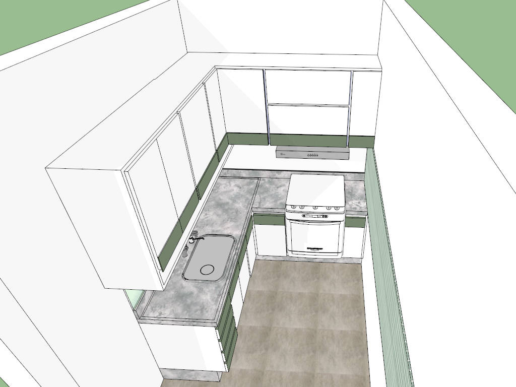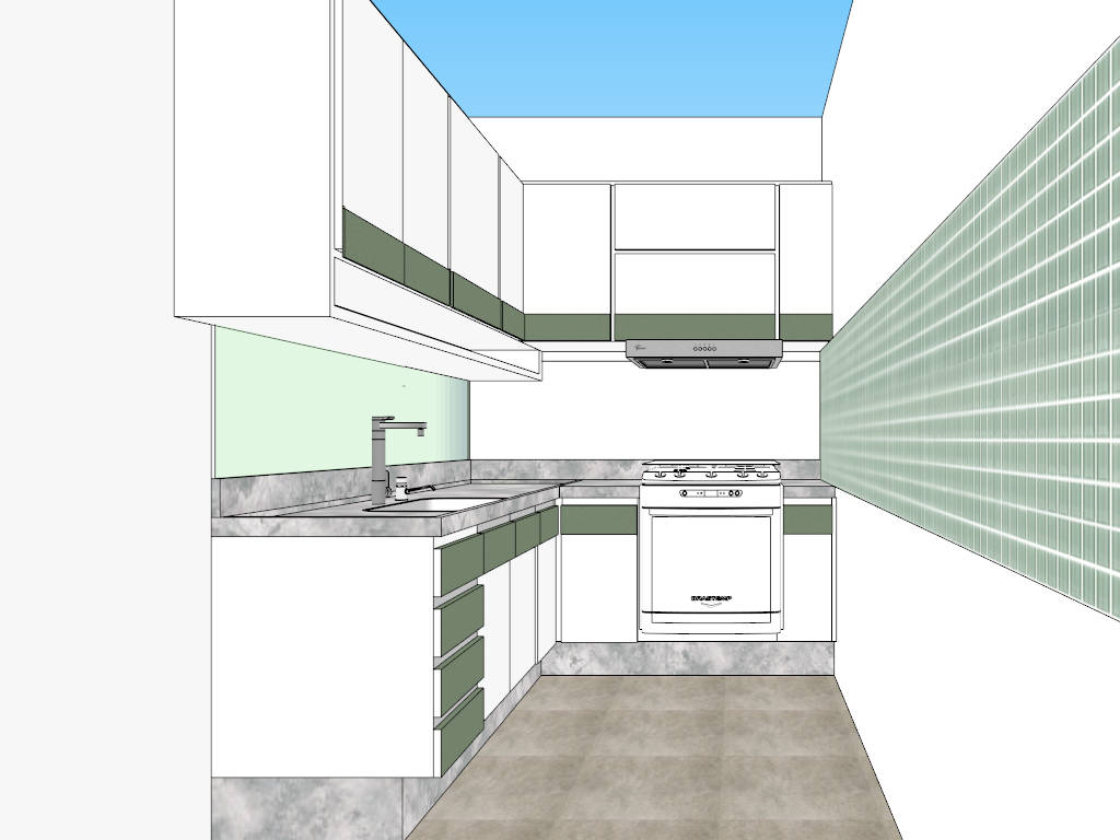 Green and white small apartment kitchen sketchup 3d model for kitchen interior design.