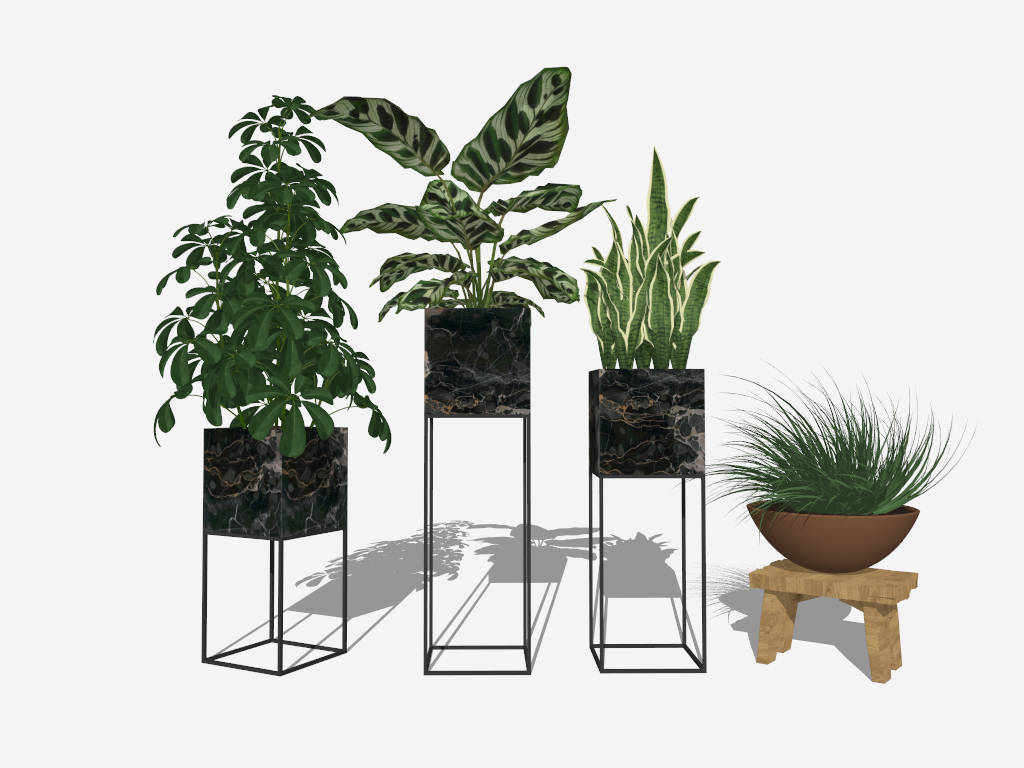 Indoor metal plant stands potted heptapleurum arboricola, snake plant, ornamental grass, and peacock plant sketchup 3d model for interior design or landscape design.