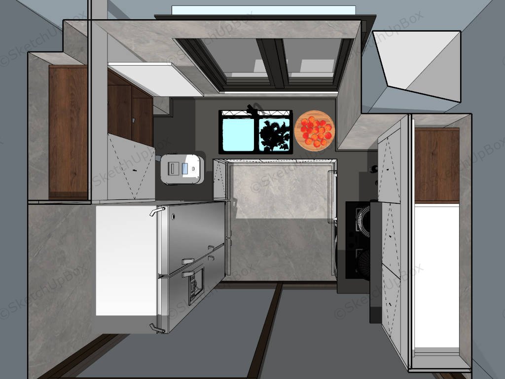 Small square kitchen design ideas sketchup 3d model for interior design, white kitchen cabinets and black countertops, double sink, double door refrigerator and other kitchen appliances.