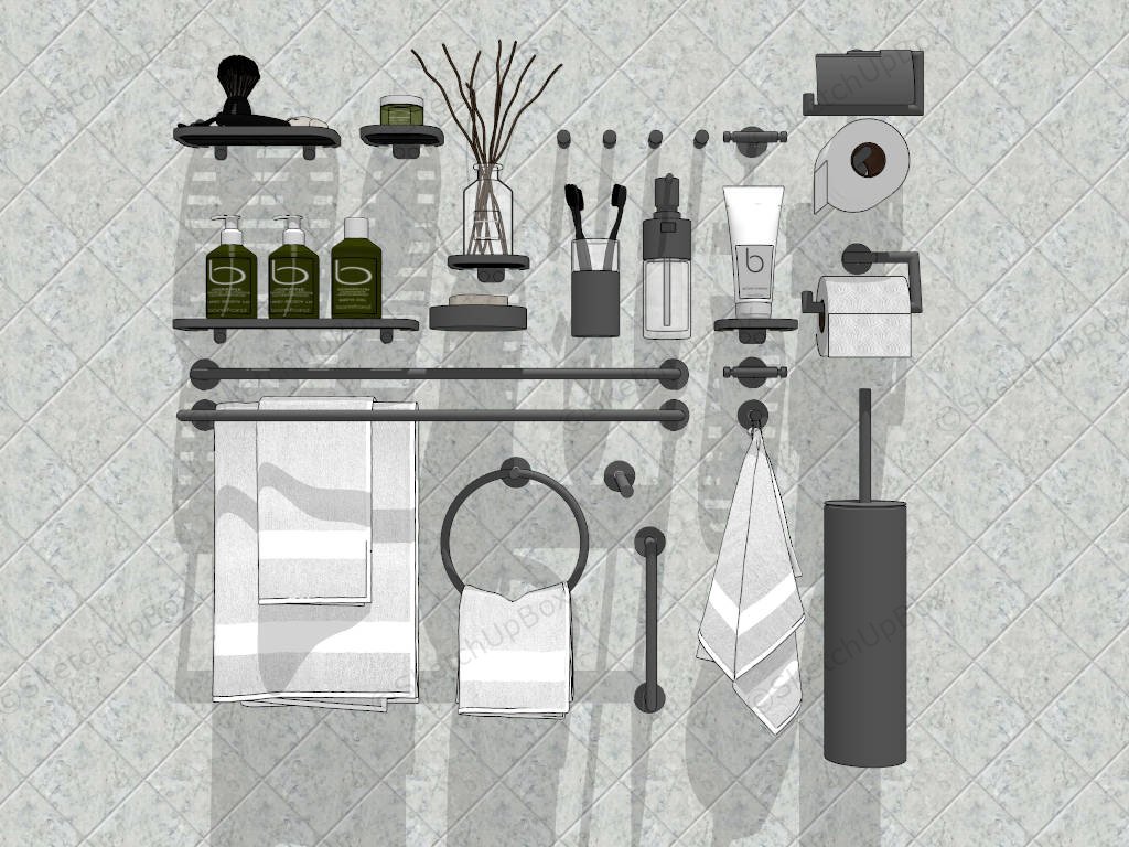 Bathroom Accessories Set Bathroom 1.28kA collection of bathroom accessories sketchup 3d model.DownloadEdges:734459Faces:482144File Version:SketchUp 8.skp File Size:111 MBTag Count:1Materials:45Render:NoneBathroom Accessories