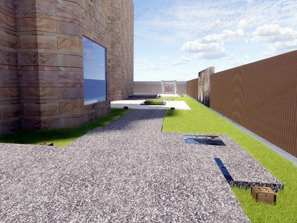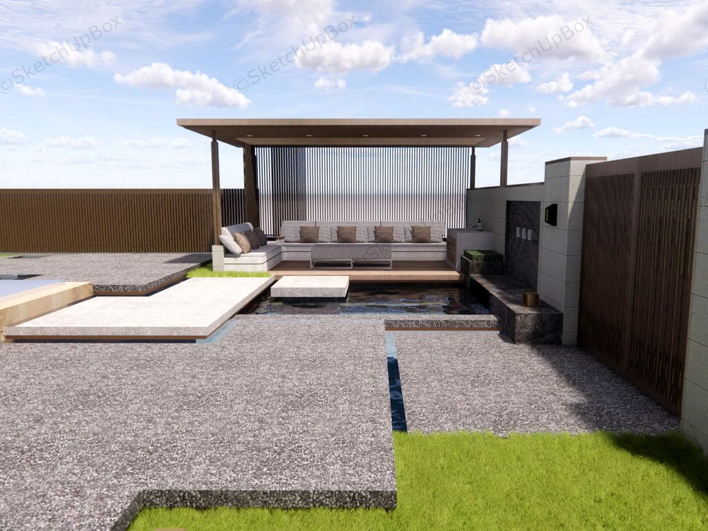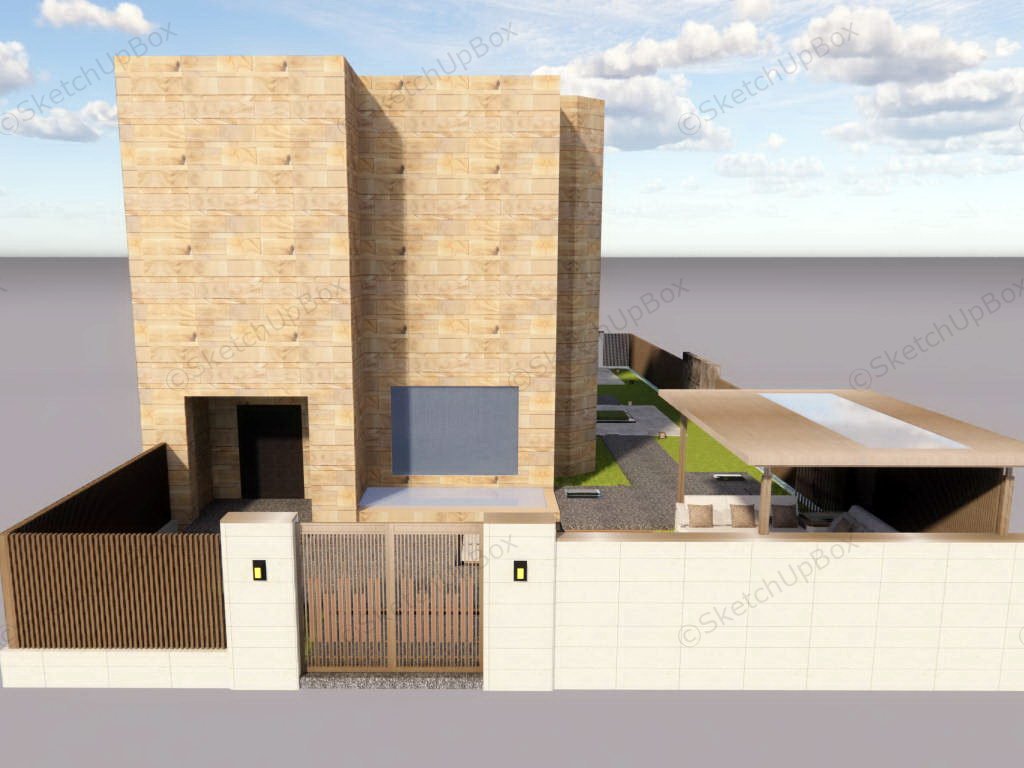 Postmodernism architecture house and garden design sketchup 3d model, metal front gate and boundary wall, a wood pavilion in the front yard, house and courtyard surrounded by wall and fence.