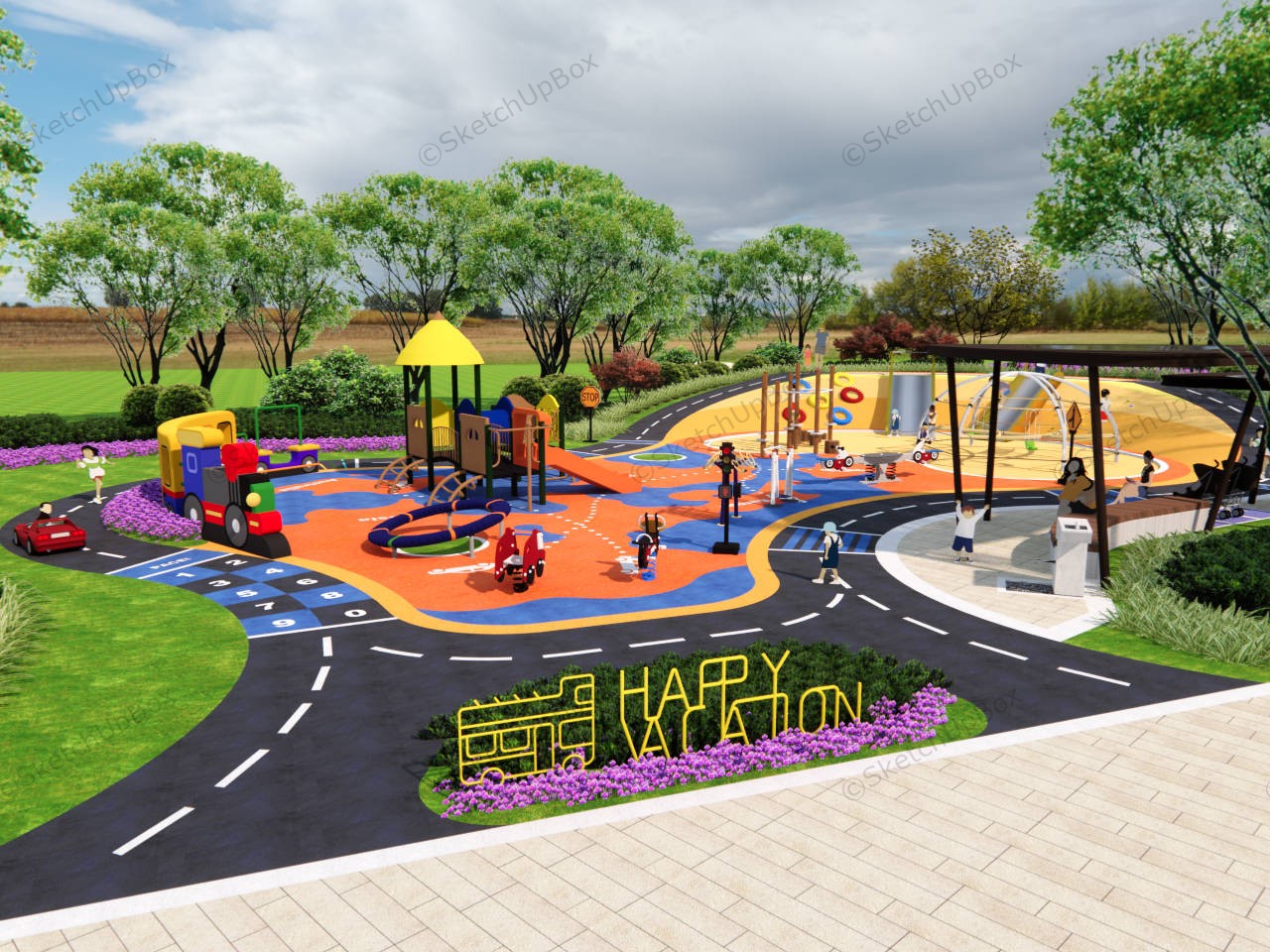 Racing car theme park adventure playground sketchup 3d model, kids racing track, train, playground climbing structure, sandpit, seesaw, and kids playground equipment.
