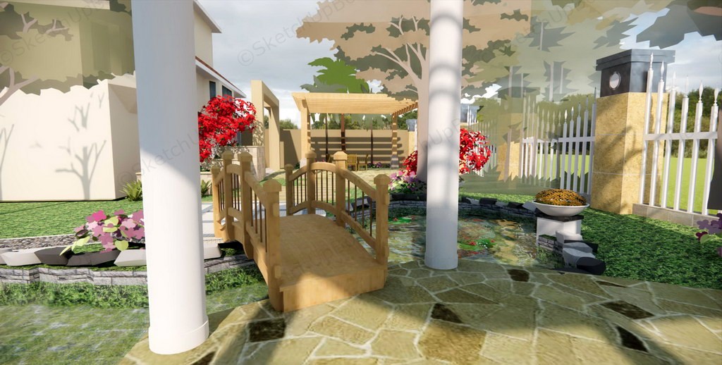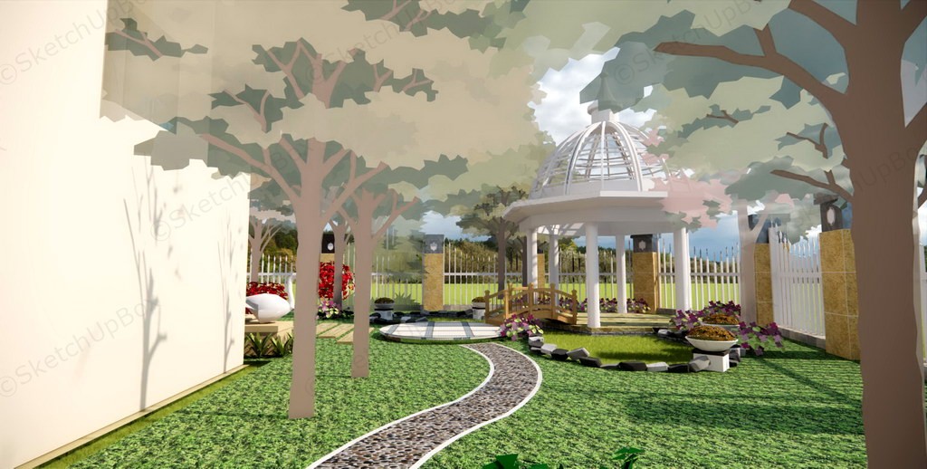Two story house with garden sketchup 3d model, the elements of backyard garden include trees, lawn, Roman pavilion, pond, wood pergola and patio furniture set.
