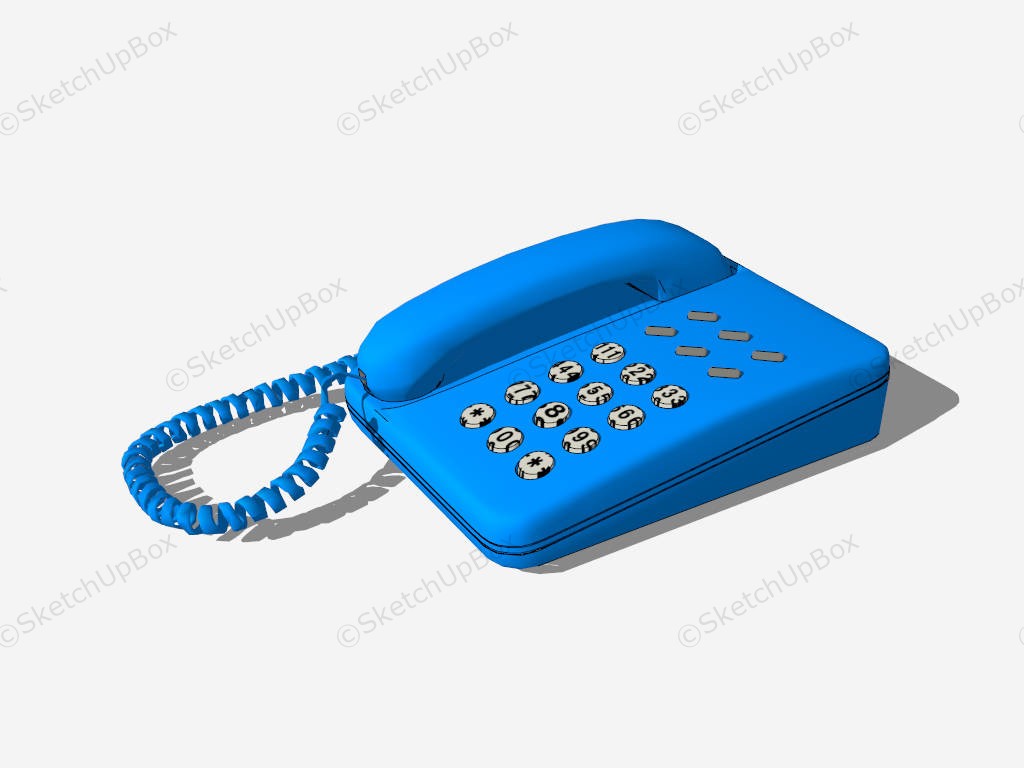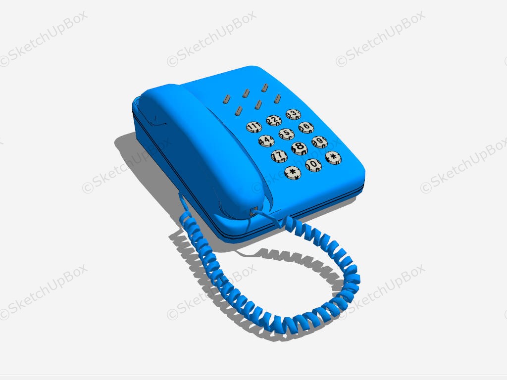 Blue Desk Phone Electronics 756Blue desk phone sketchup 3d model.DownloadEdges:14397Faces:9054File Version:SketchUp 8.skp File Size:1.68 MBTag Count:2Materials:12Render:NonePhones