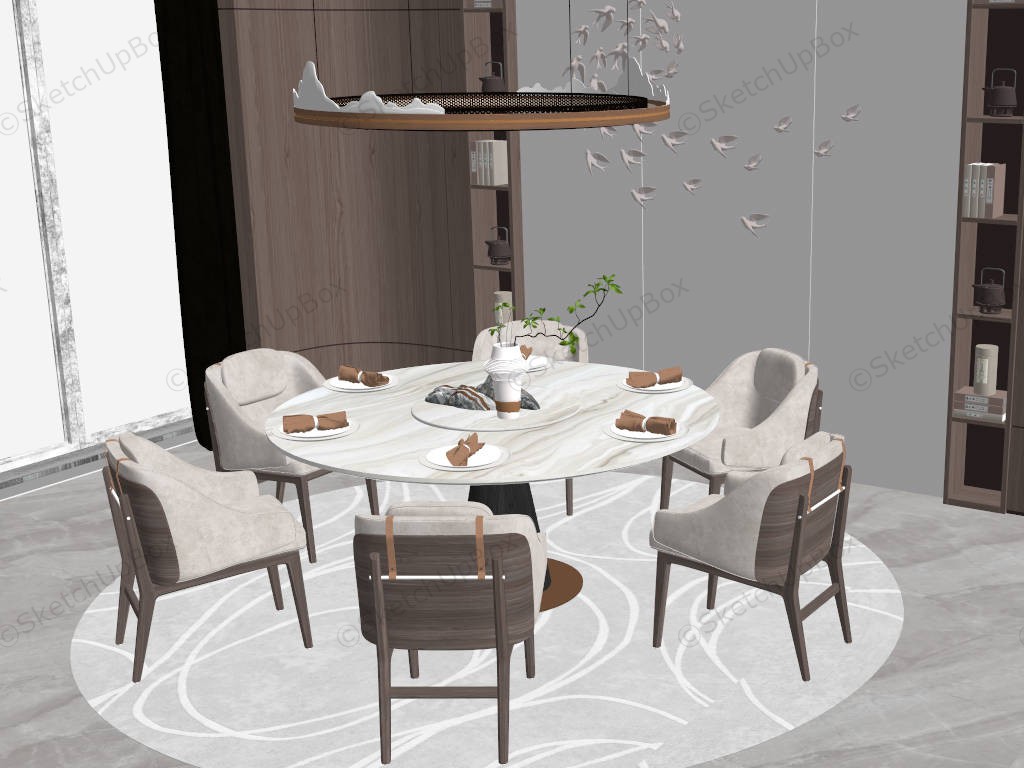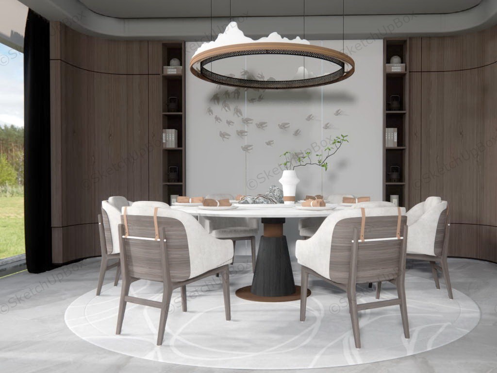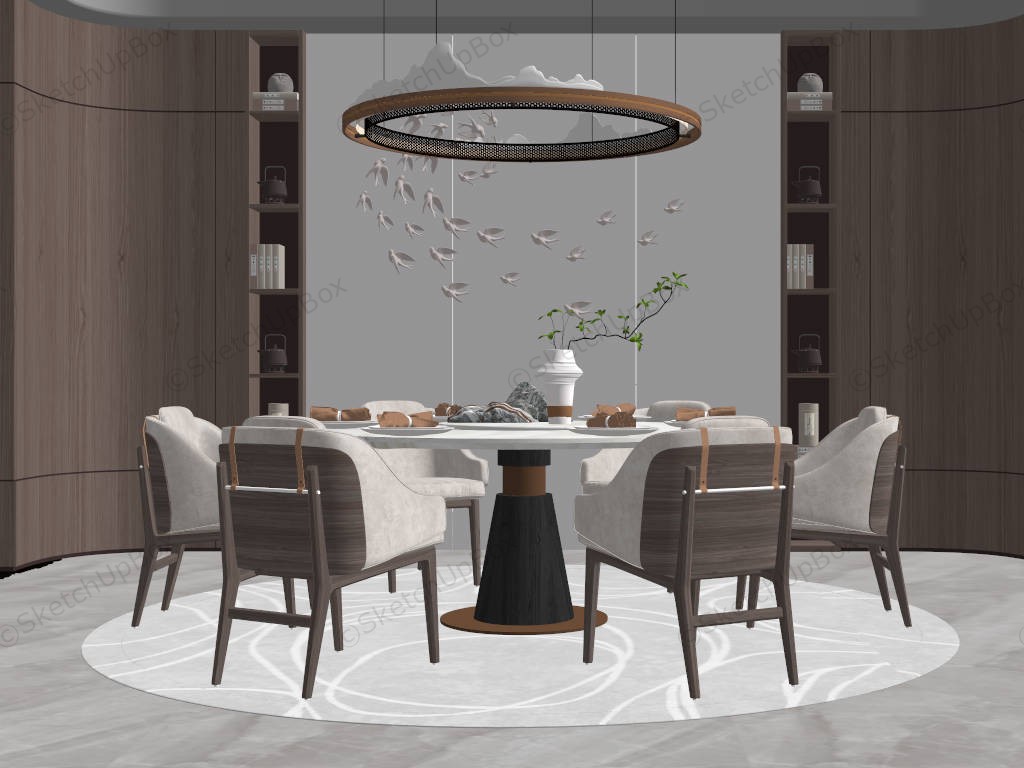 Modern dining room ideas round dining table and 6 chairs set, ring chandeliers lighting, bird relief accent wall with side shelves.