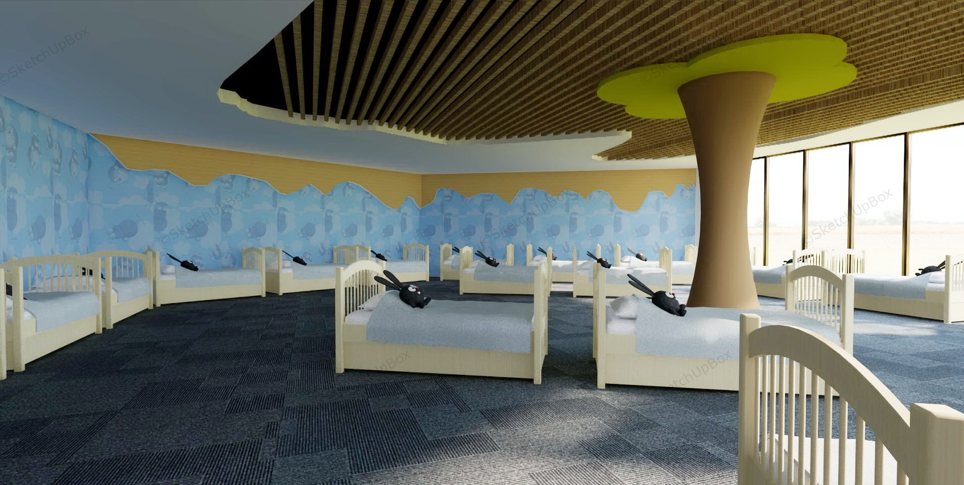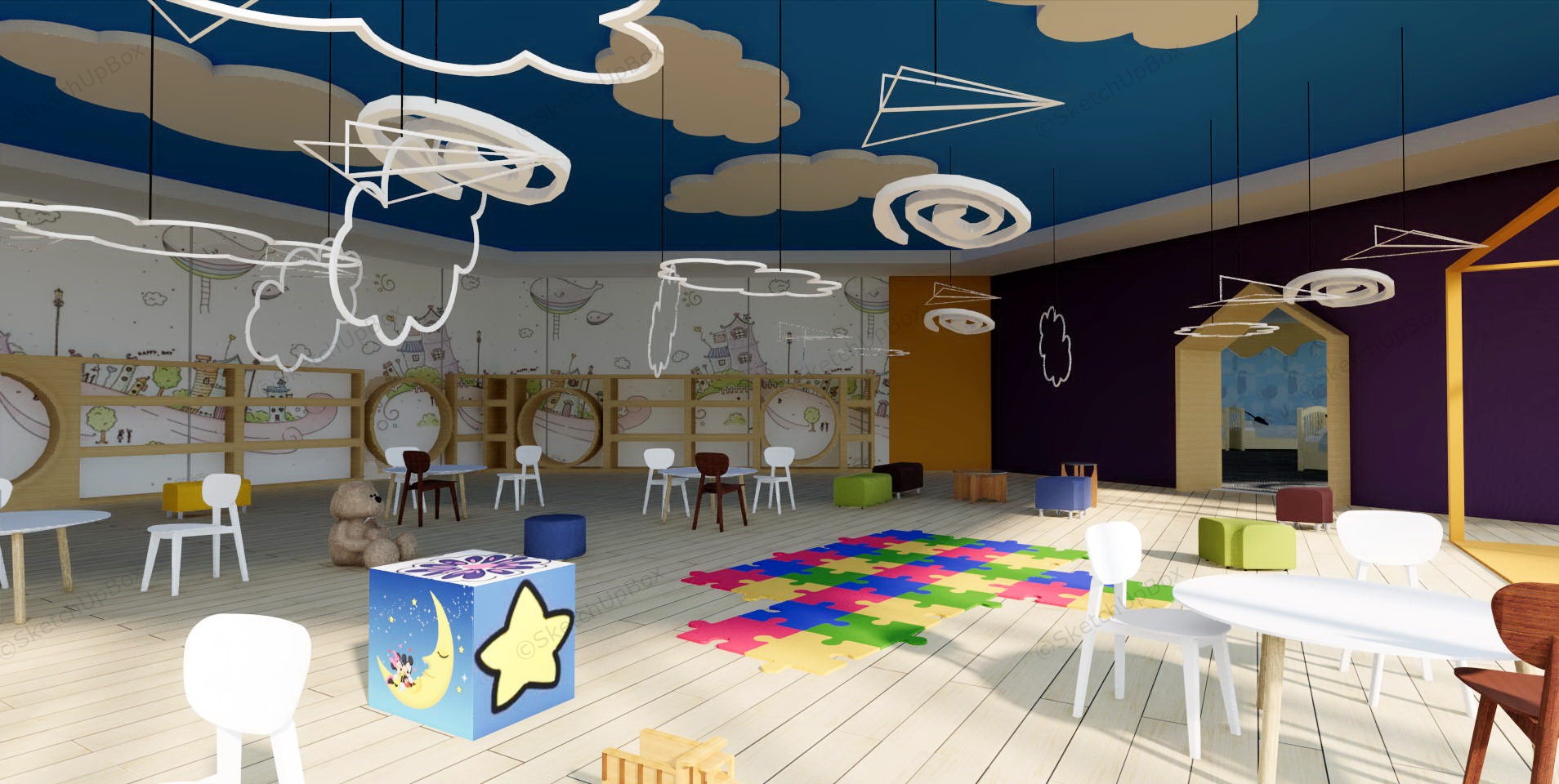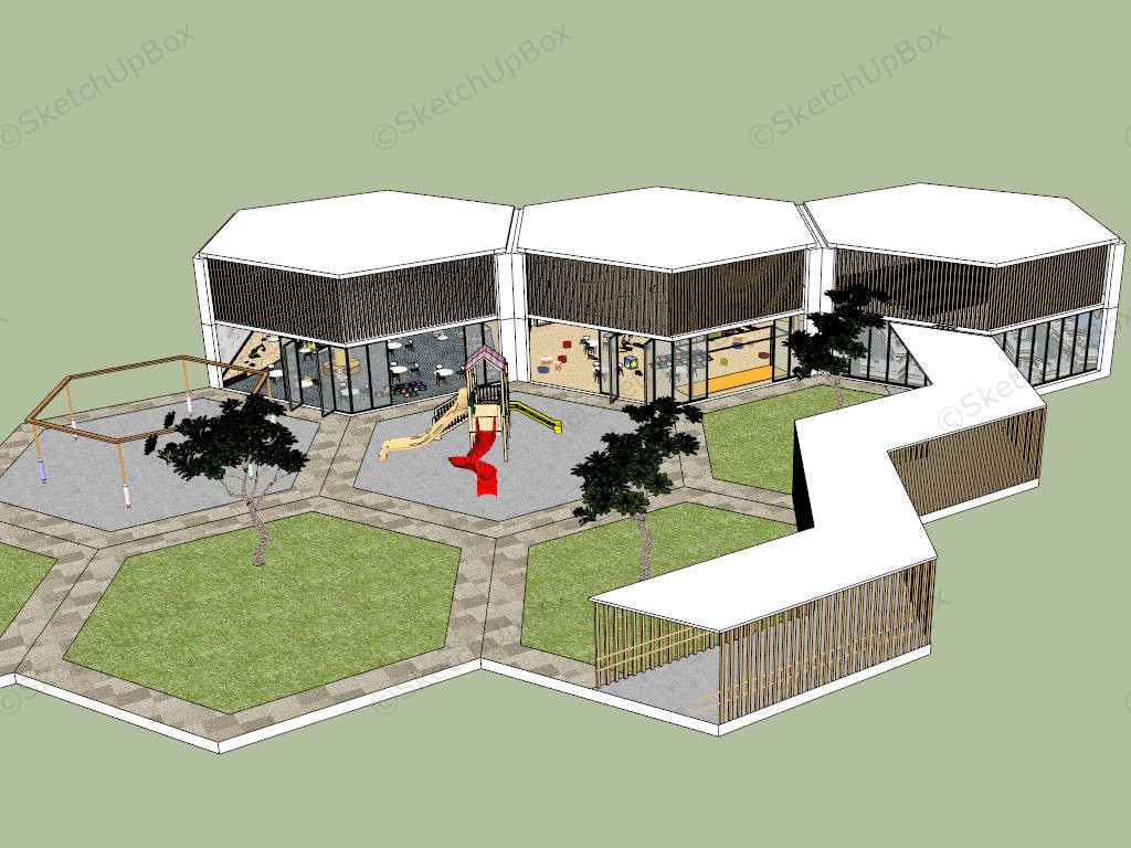 Preschool building architecture design and interior design idea sketchup 3d model, including indoor and outdoor playground, reading room, playroom, and nap room.