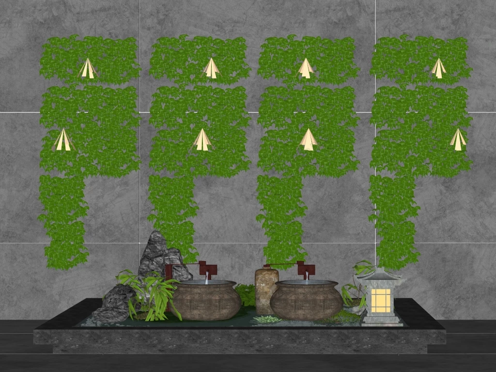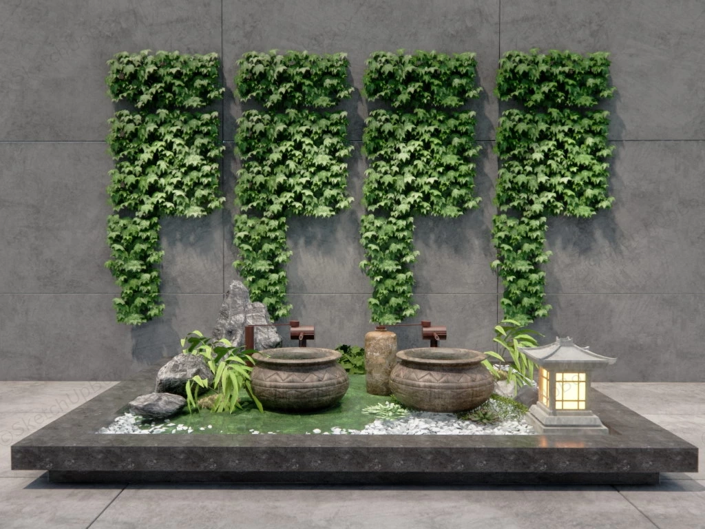 Small indoor zen garden ideas with green wall, fountains and lantern sketchup 3d model for landscape design.