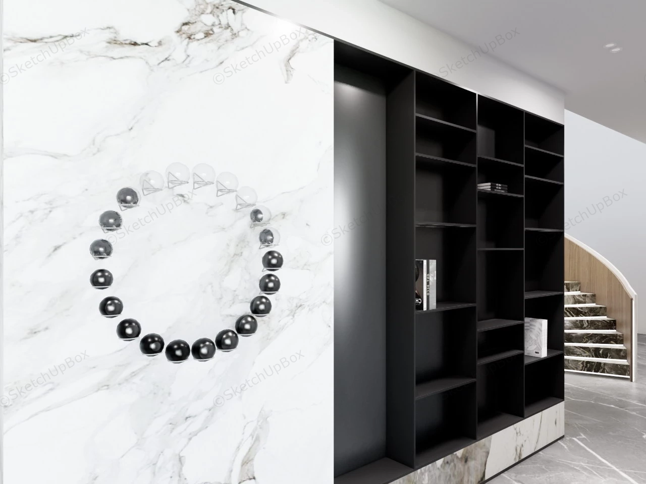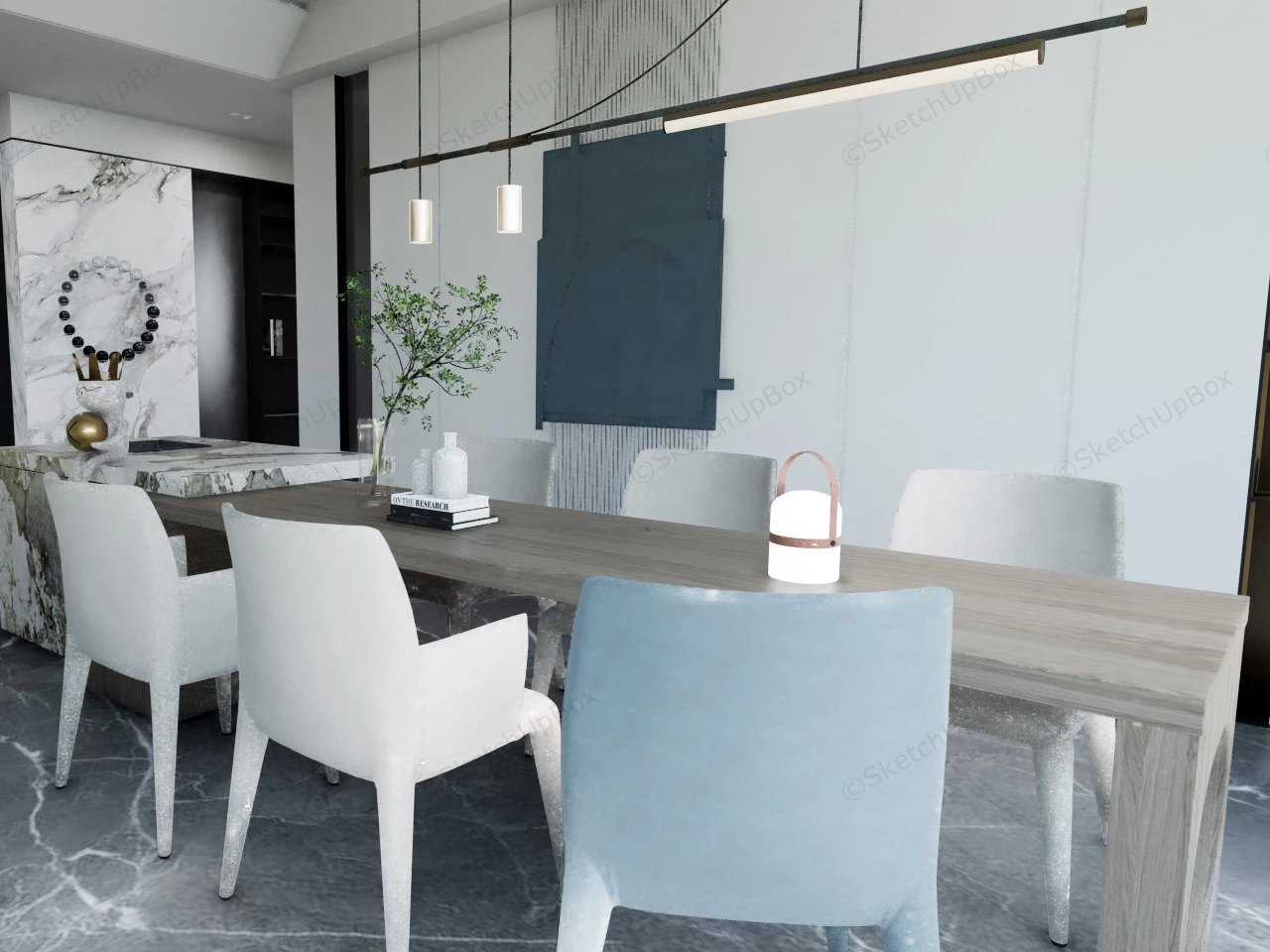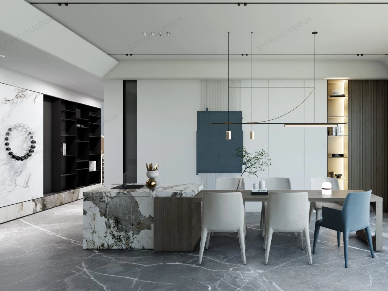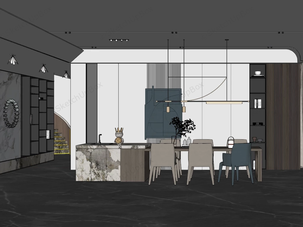 Modern white marble island wood dining set with table and chairs, accent wall with shelf sketchup 3d model for interior design.