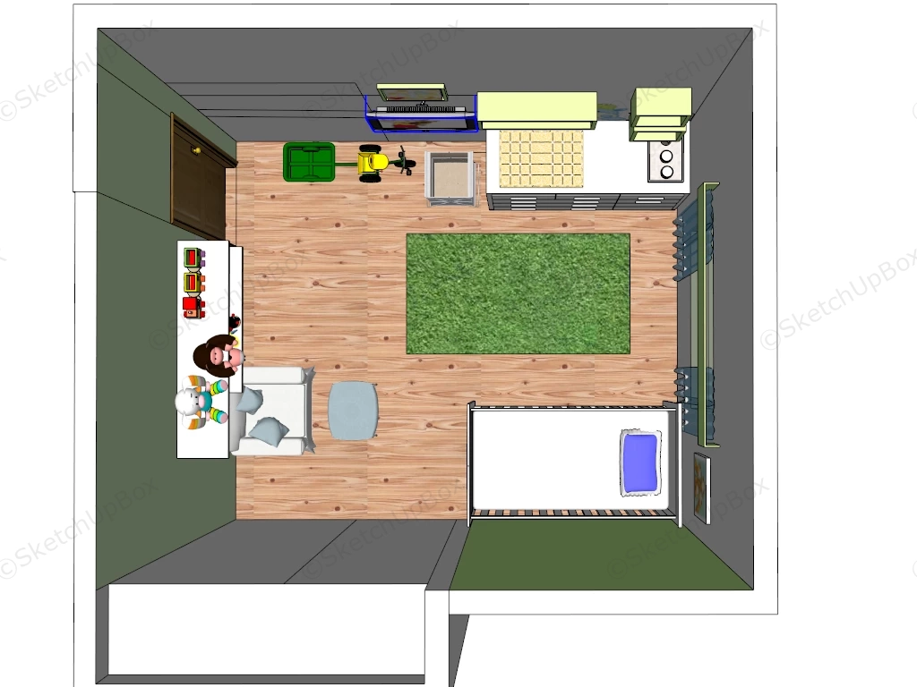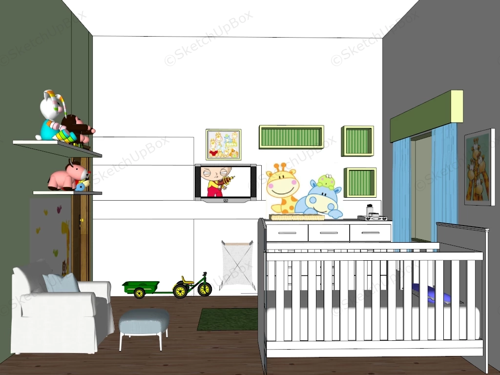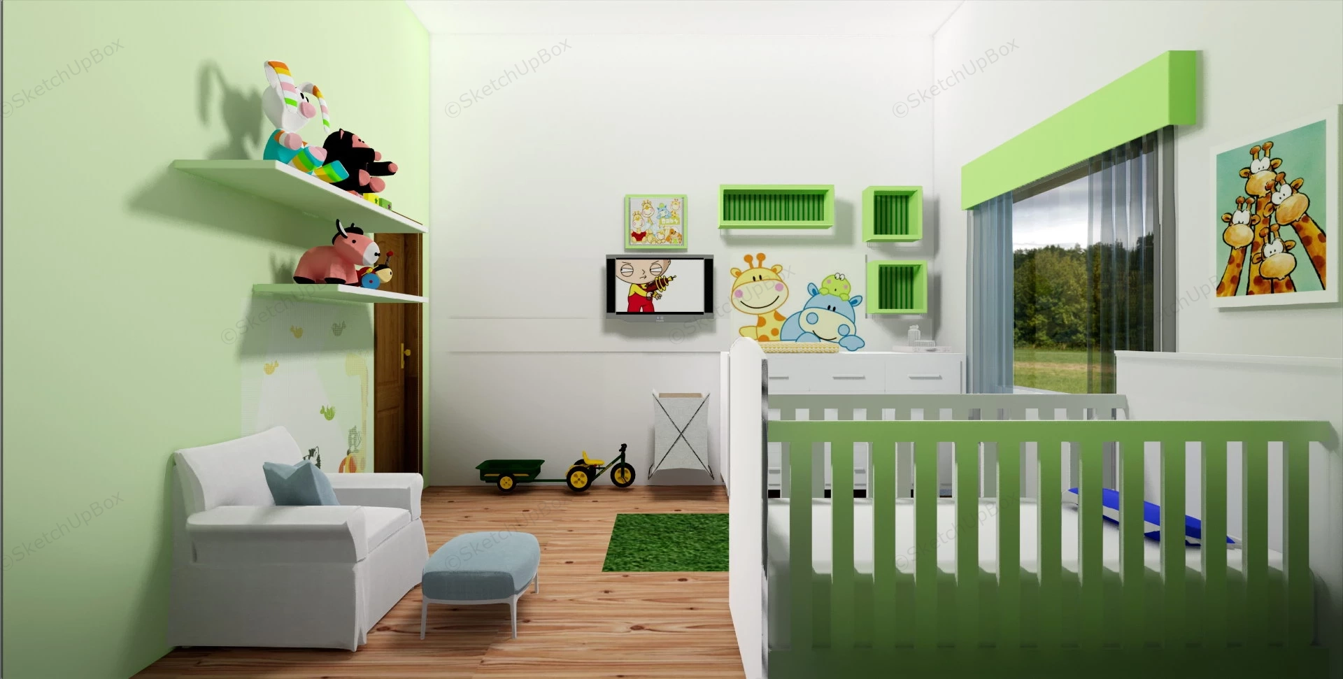 White and green baby nursery ideas sketchup 3d model, sofa and ottoman set, white crib, baby dresser, wardrobe, and wall shelf.