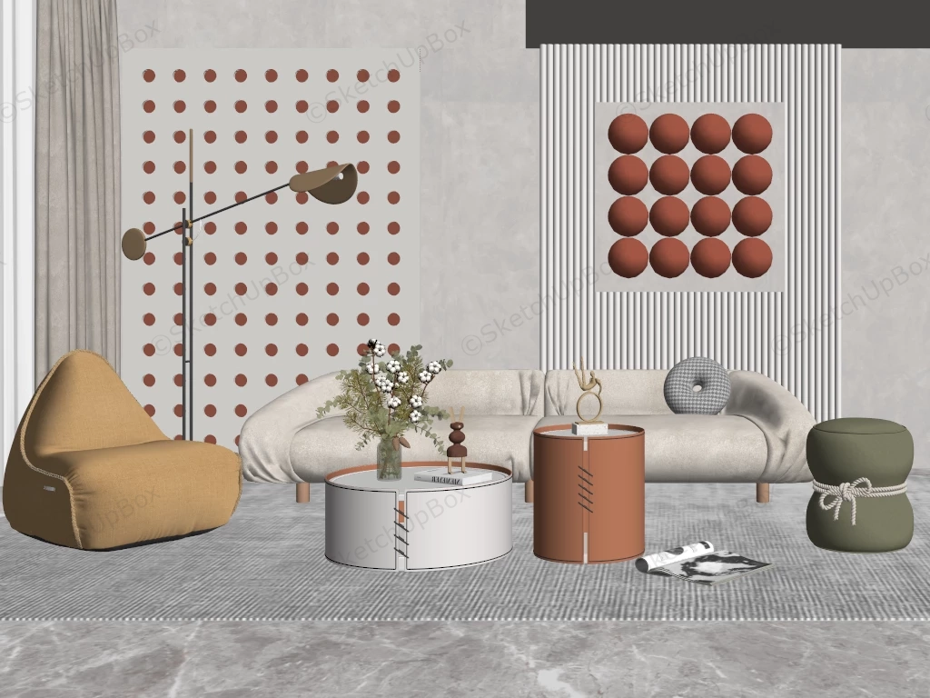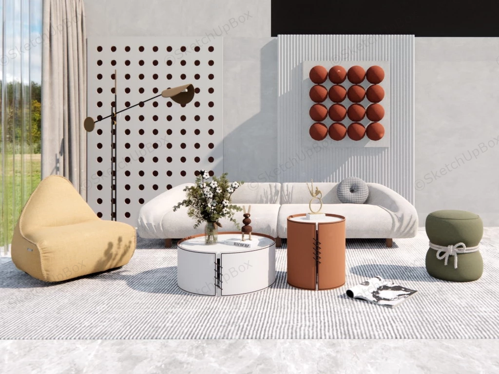 Stylish living room design sketchup 3d model, sofa, bean bag chair, coffee table, floor lamp and living accent wall.
