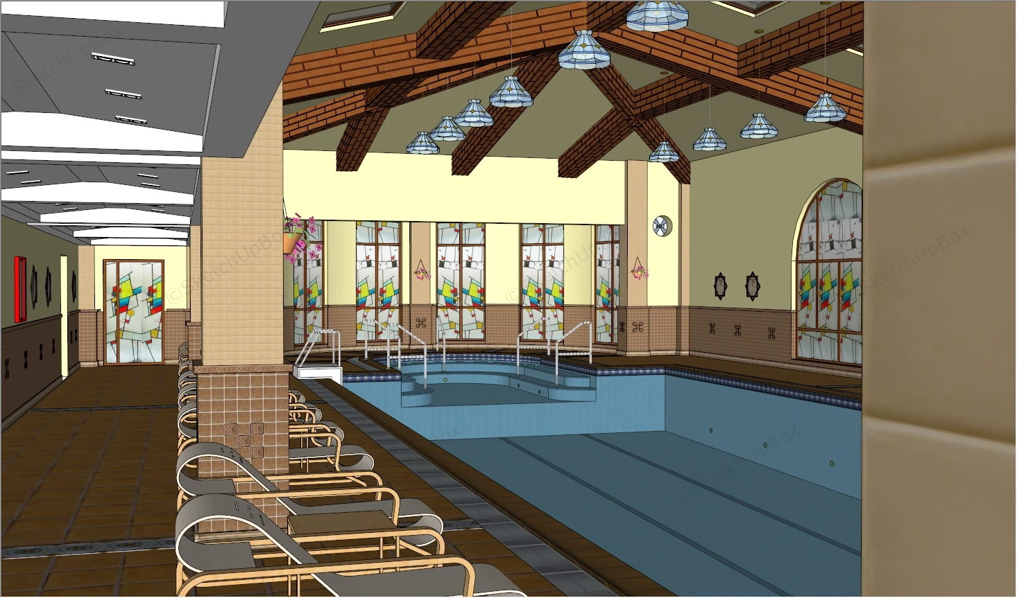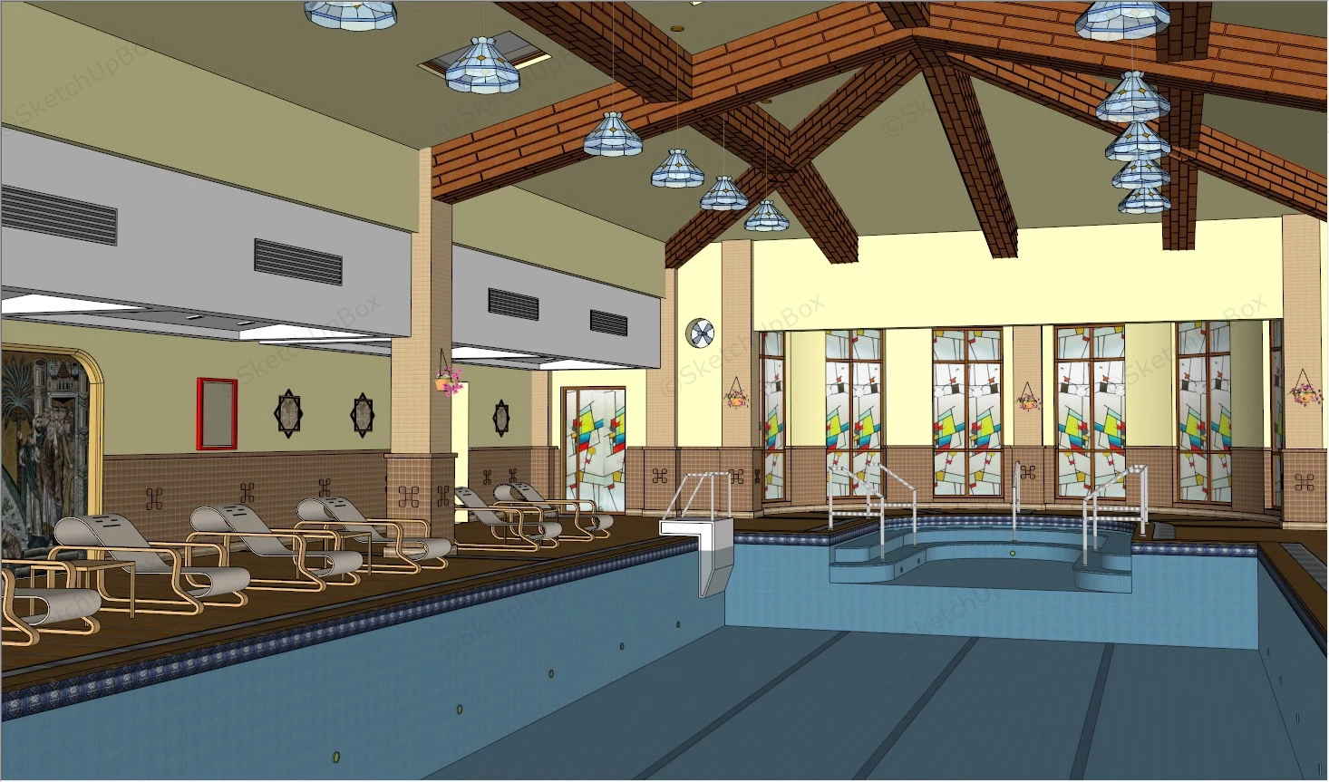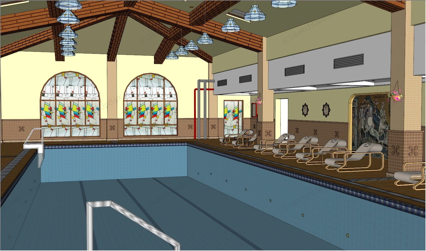 Vintage Indoor Swimming Pool Sports Venue 1.14kVintage indoor swimming pool sketchup 3d model.DownloadEdges:139259Faces:46060File Version:SketchUp 8.skp File Size:5.48 MBTag Count:38Materials:53Render:NoneSwimming Pool
