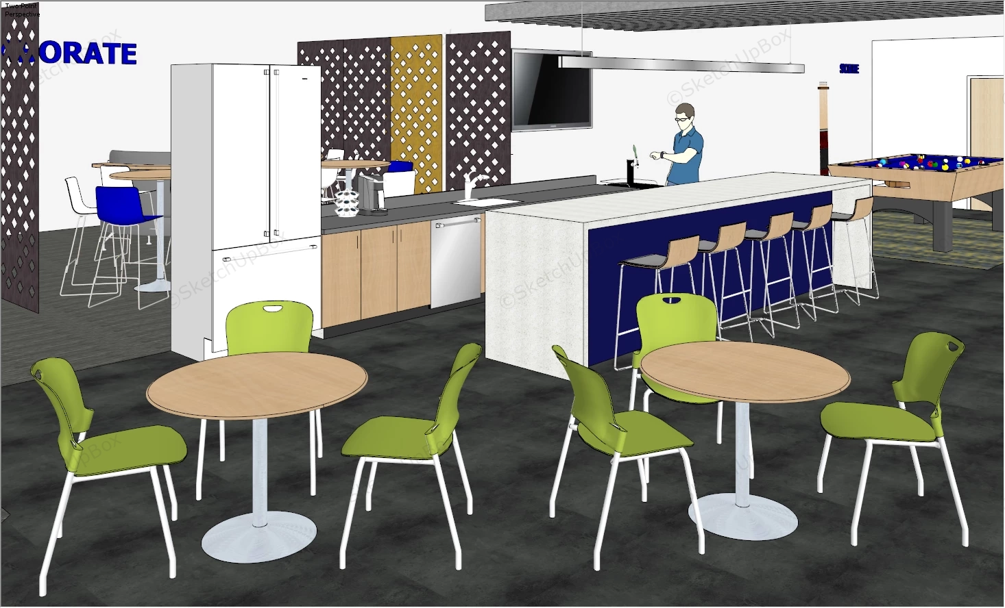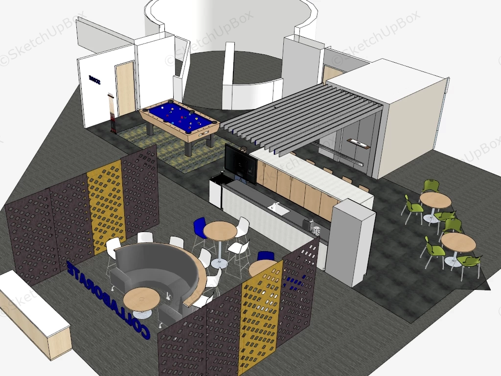 Break Room Design Office 346Office breakroom design bar and billiard sketchup 3d model.DownloadEdges:538898Faces:277310File Version:SketchUp 8.skp File Size:30.1 MBTag Count:22Materials:113Render:NoneBreakroom