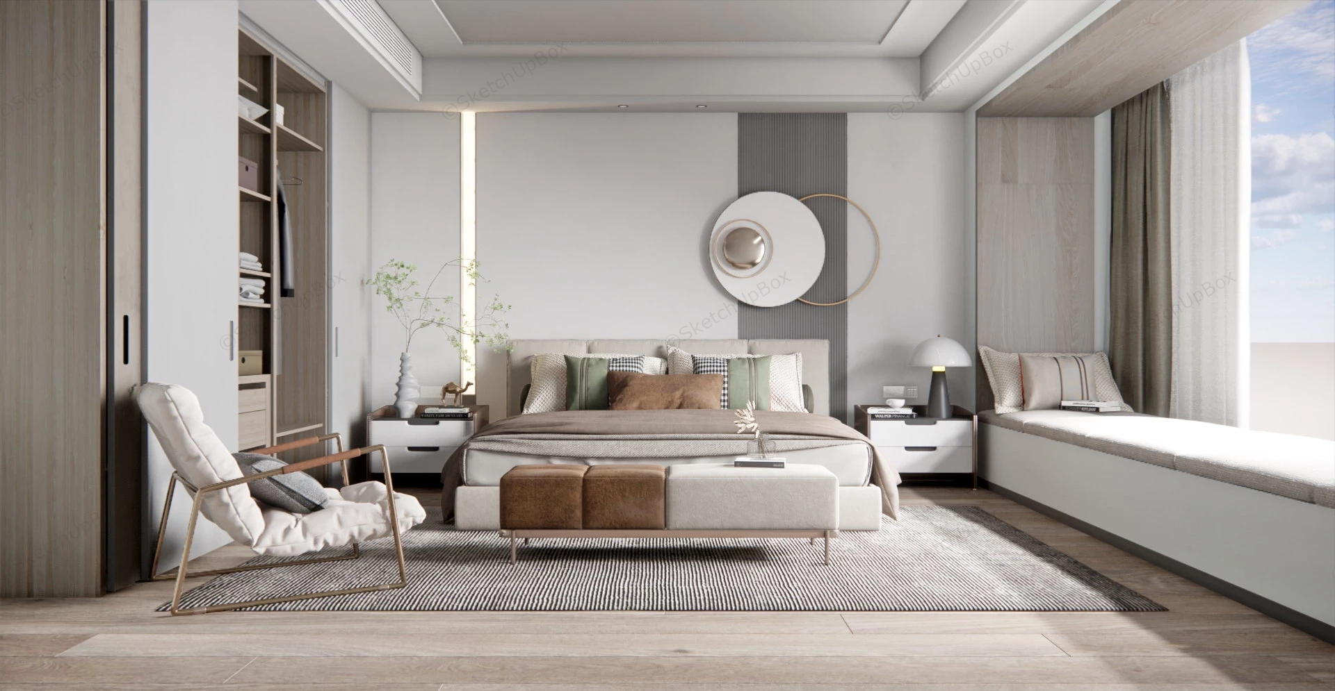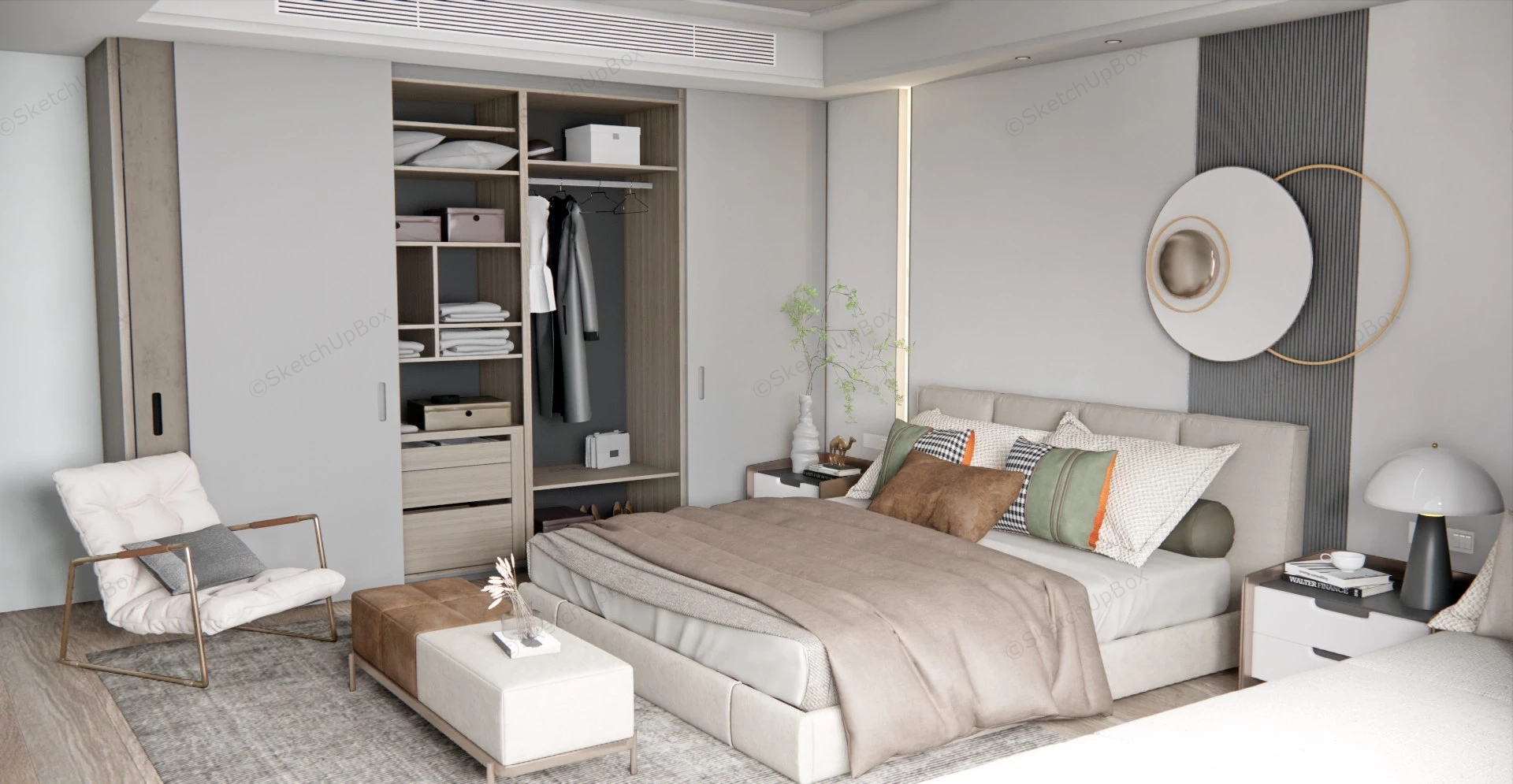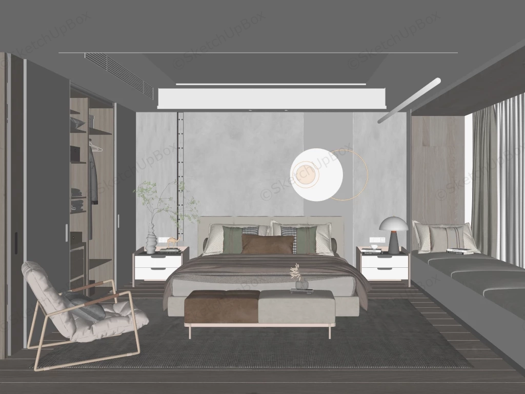 Modern style bedroom interior design sketchup 3d model, upholstered bed with headboard and accent wall, nightstands, wall mount wardrobe cabinet, armchair and bed bench.