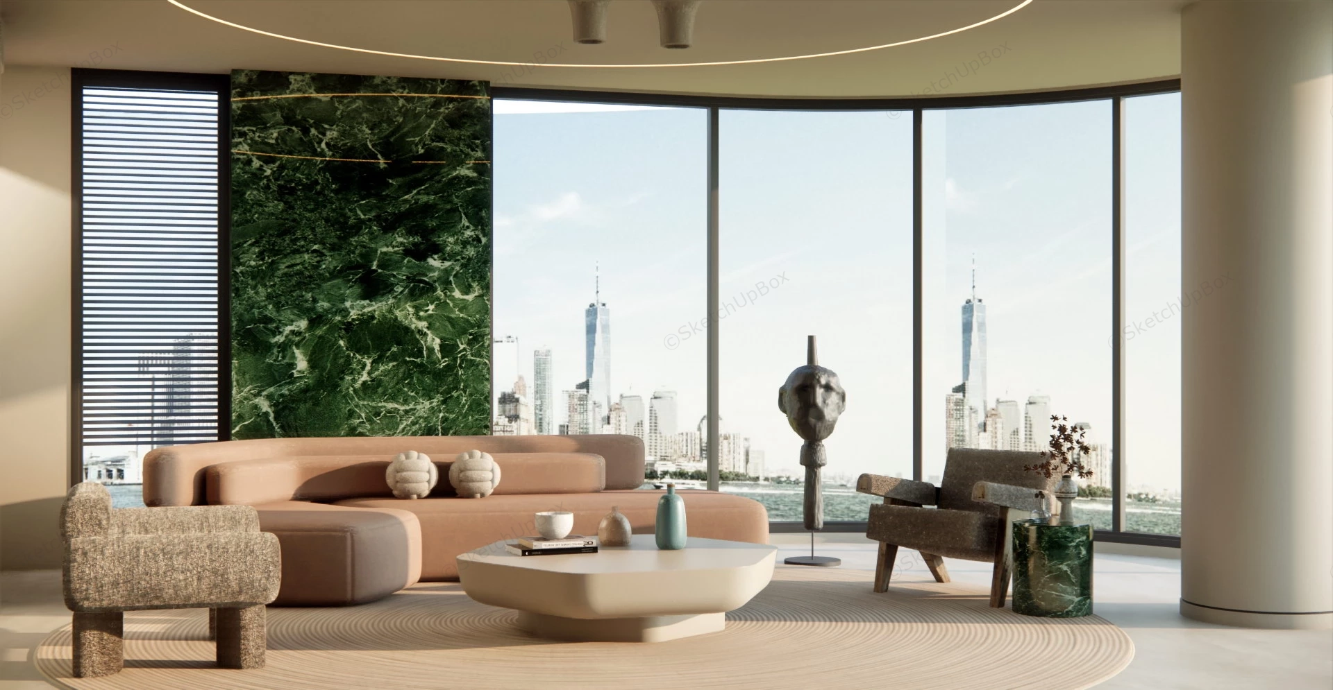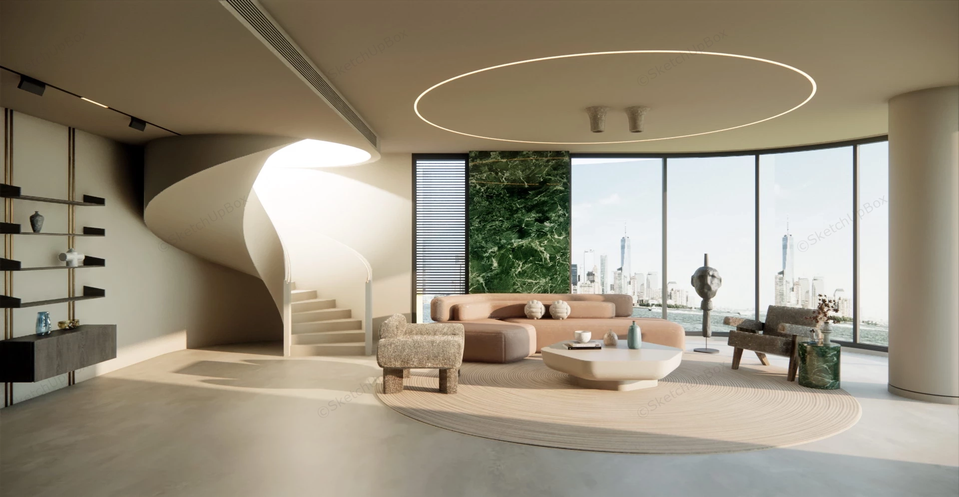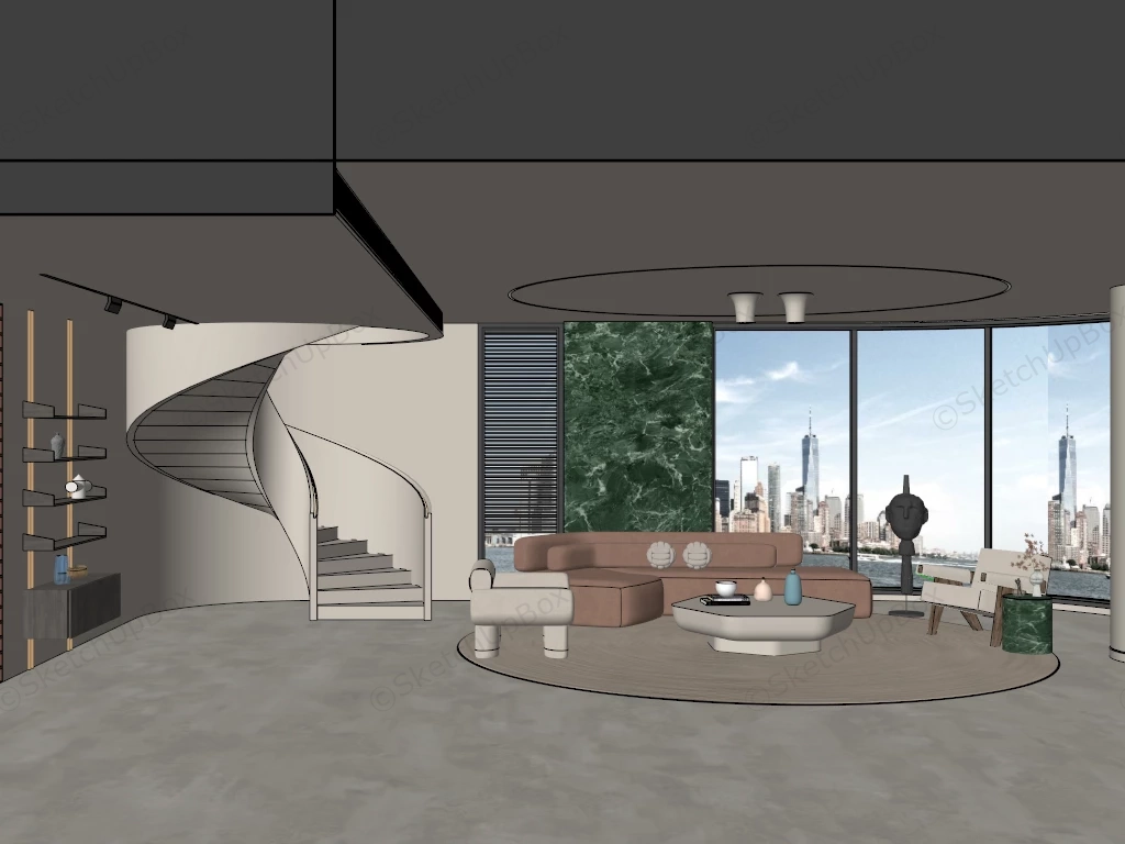 Modern minimalist round living room design ideas sketchup 3d model, brown sofa, armchairs, coffee table and decorations.