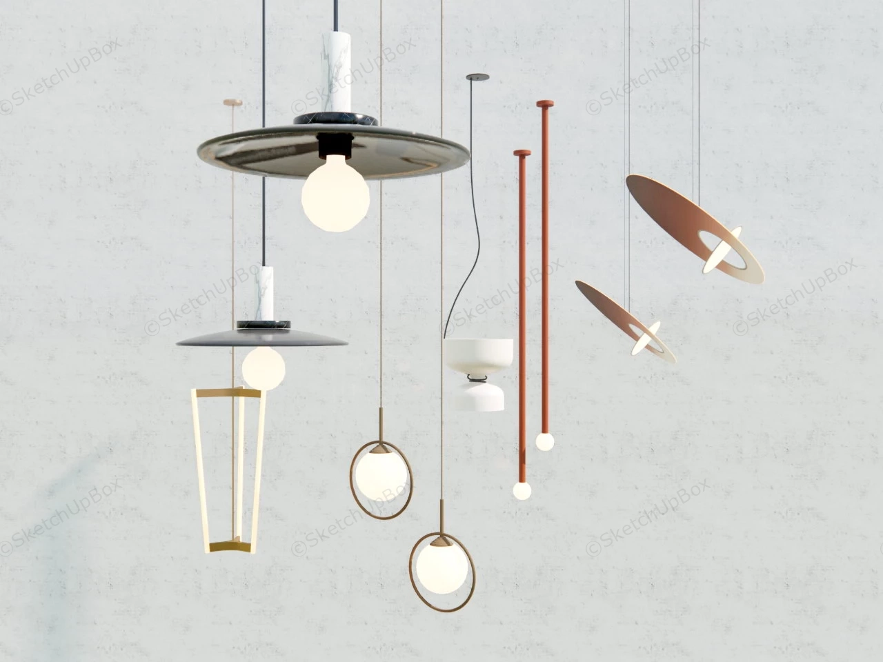 Contemporary Pendant Lights Lighting 1.51kA collection of contemporary pendant lighting fixtures sketchup 3d model.DownloadEdges:94866Faces:61450File Version:SketchUp 8.skp File Size:8.19 MBTag Count:1Materials:30Render:NonePendant Lights
