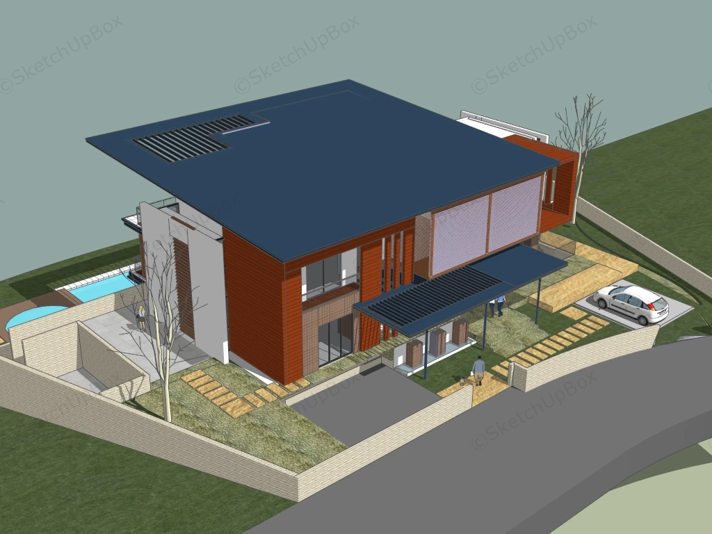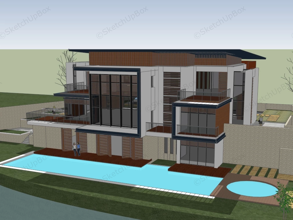 Modern House With Pool Residential Buildings 1.41kModern house with swimming pool sketchup 3d model.DownloadEdges:64897Faces:26791File Version:SketchUp 8.skp File Size:6.44 MBTag Count:1Materials:56Render:NoneHouses
