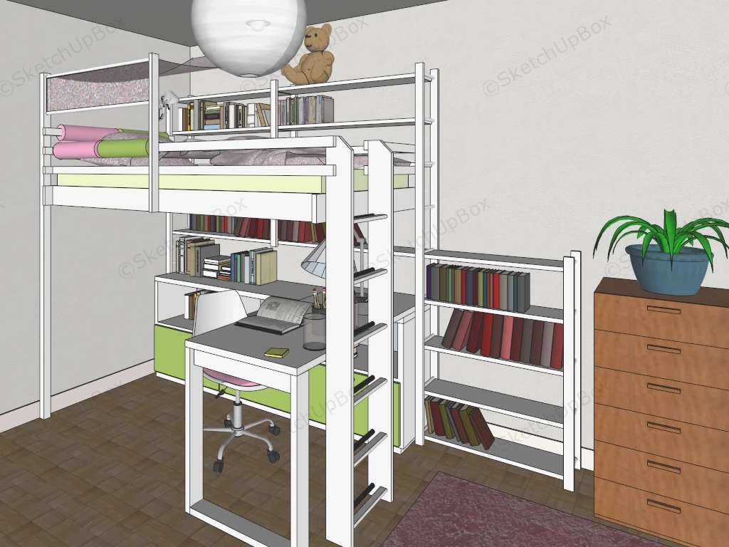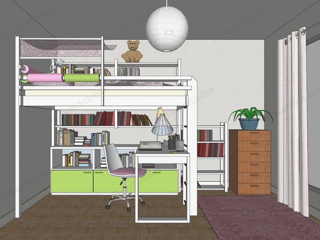 Loft Bed Kids Room With Desk Bedroom 712Small kids room with loft bed and desk sketchup 3d model.DownloadEdges:149337Faces:74798File Version:SketchUp 8.skp File Size:19.6 MBTag Count:3Materials:175Render:NoneKids Room