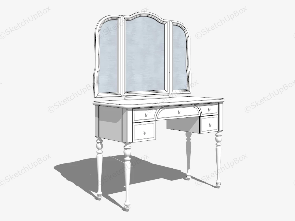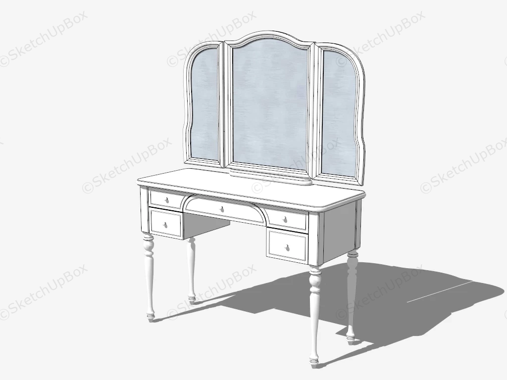 White Makeup Vanity With Mirror Furniture 637White makeup vanity table with mirror sketchup 3d model.DownloadEdges:8521Faces:3893File Version:SketchUp 8.skp File Size:485 KBTag Count:1Materials:1Render:NoneBedroom FurnitureDressing TablesMakeup Vanity