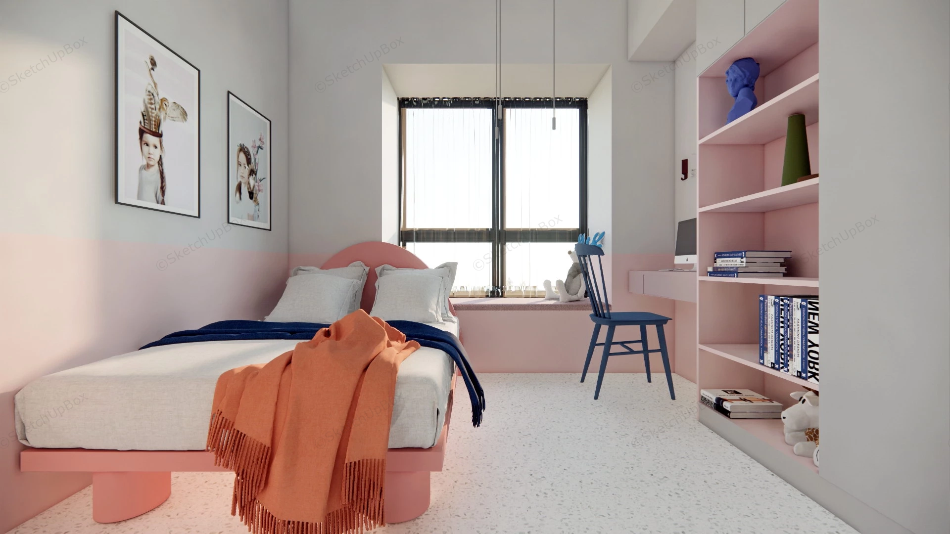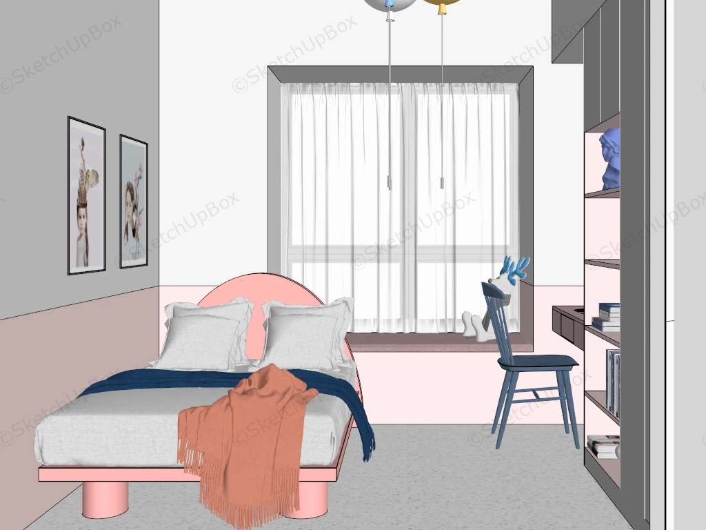 Pink Little Girls Room Bedroom 1.44kSmall pink girls bedroom with computer desk and bookshelf sketchup 3d model.DownloadEdges:968245Faces:592190File Version:SketchUp 8.skp File Size:92.1 MBTag Count:23Materials:100Render:NoneKids Room