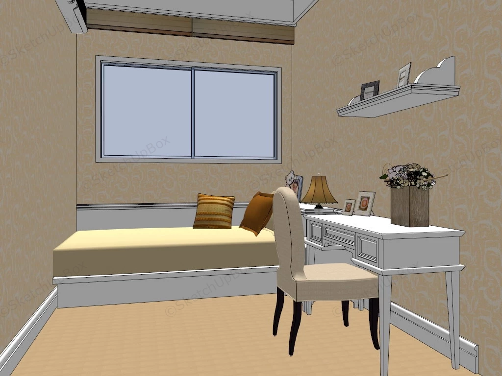 Small Bedroom With Desk Bedroom 993Simple small bedroom with desk and chair sketchup 3d model.DownloadEdges:47504Faces:18343File Version:SketchUp 8.skp File Size:5.34 MBTag Count:12Materials:41Render:NoneBedsDesks