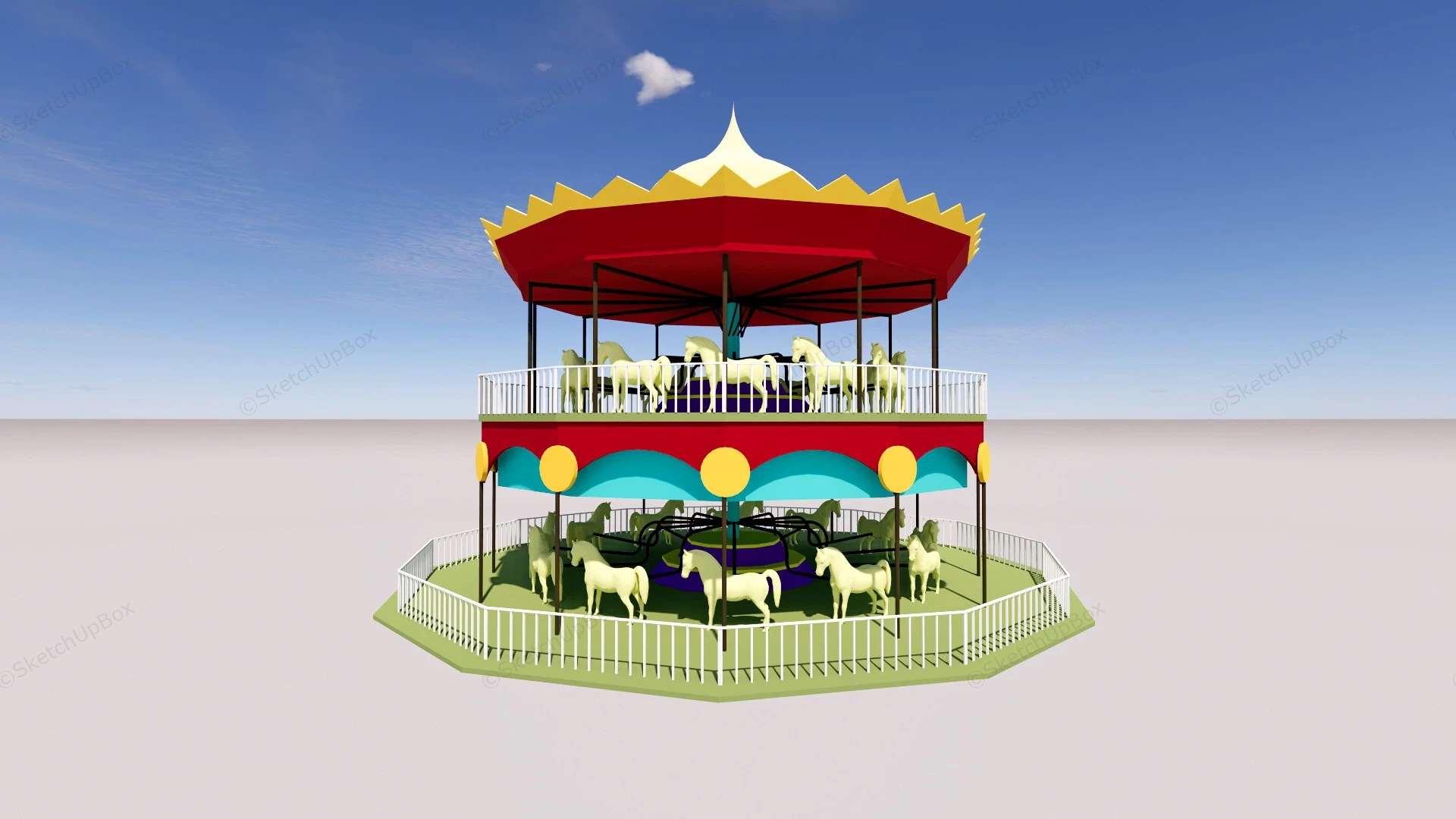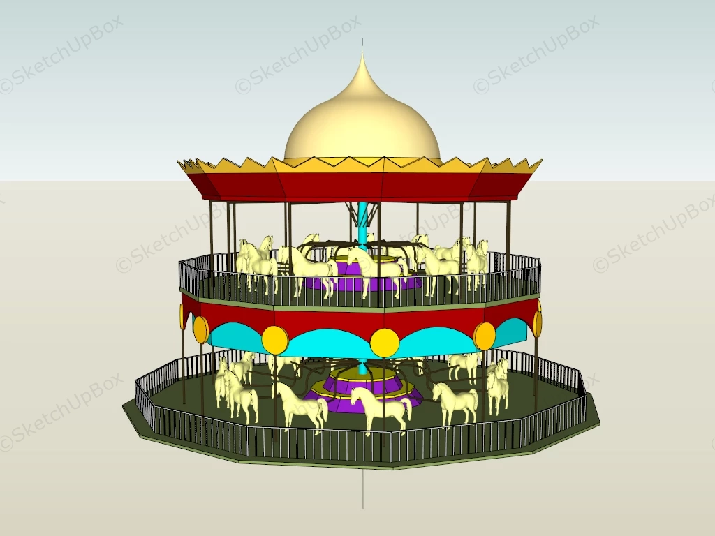 Two Tier Carousel Recreation 1.37k2-Tier carousel amusement ride sketchup 3d model.DownloadEdges:664758Faces:433578File Version:SketchUp 8.skp File Size:3.58 MBTag Count:1Materials:11Render:NoneAmusement ParkAmusement RidesCarousel
