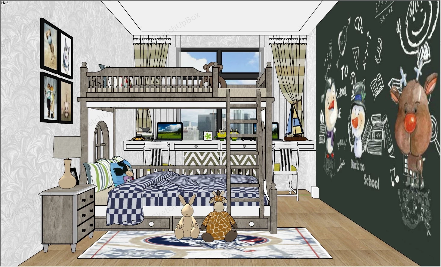 Rustic Kids Bedroom Design Idea Bedroom 1.36kRustic kids bedroom design with bunk bed and desks sketchup 3d model.VIP onlyOnly VIP downloadUpgrade VIPBuy nowEdges:634669Faces:417662File Version:SketchUp 8.skp File Size:80 MBTag Count:1Materials:106Render:NoneKids Room