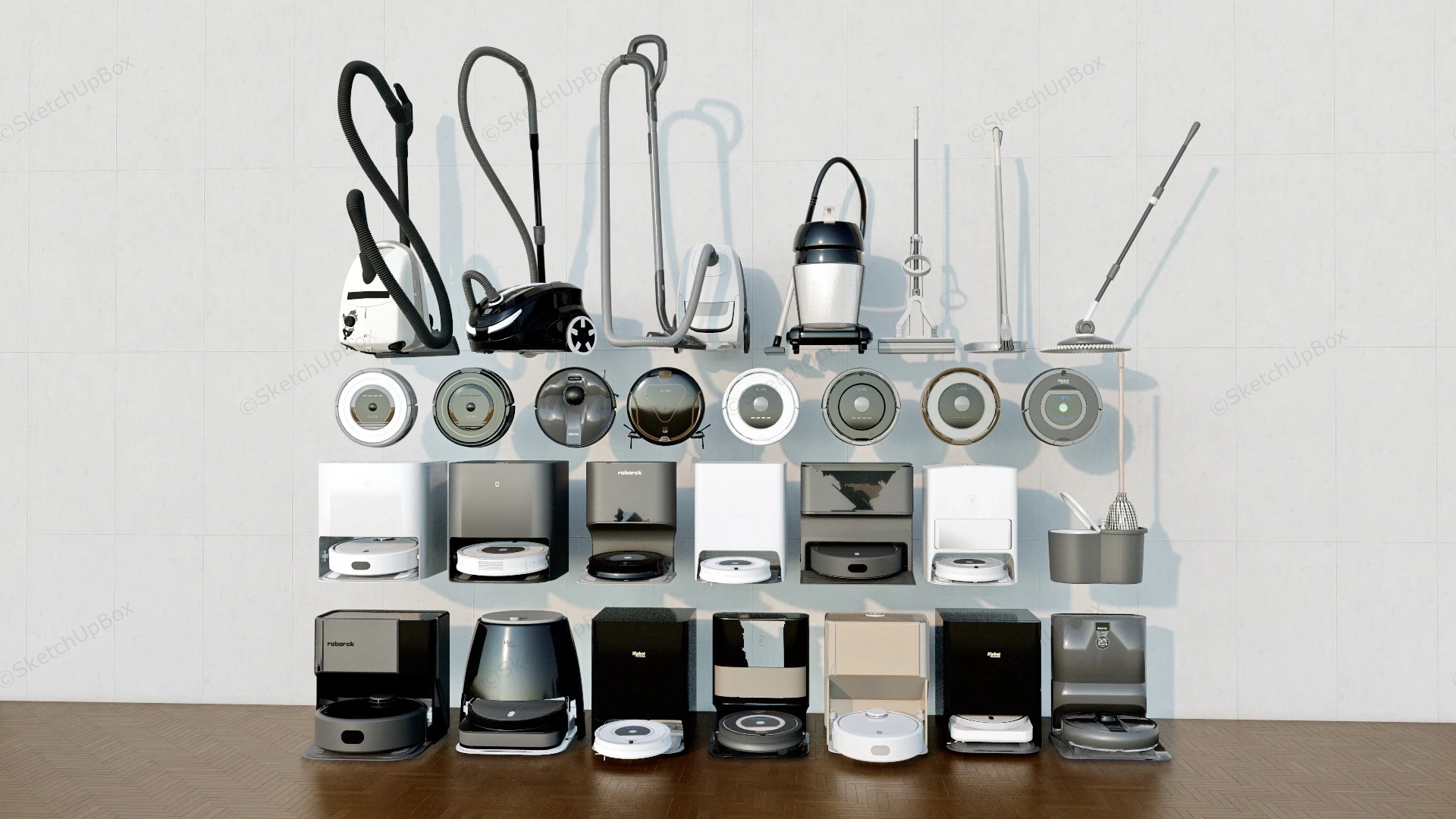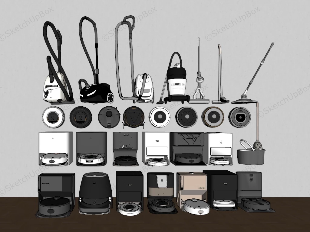 A collection of floor cleaning tools sketchup 3d model, vacuum cleaner, mop, robot vacuum and sweeper.